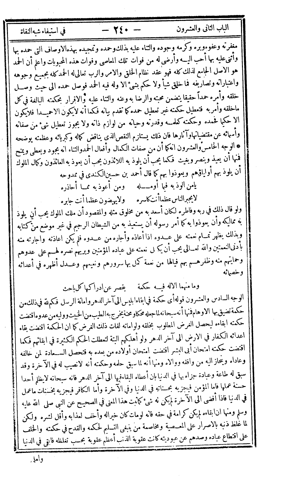 الوجه السادس والعشرون قوله أي حكمة في إبقاء إبليس إلى آخر الدهر وإماتة الرسل فكم لله في ذلك من حكمة تضيق بها الأوهام فمنها أنه سبحانه لما جعله محكا ومحنة يخرج به الطيب من الخبيث ووليه من عدوه اقتضت حكمته إبقاءه ليحصل الغرض المطلوب بخلقه ولو أماته لفات ذلك الغرض كما أن الحكمة اقتضت بقاء أعدائه الكفار في الأرض إلى آخر الدهر ولو أهلكهم البتة لتعطلت الحكم الكثيرة في إبقائهم فكما اقتضت حكمته امتحان أبي البشر اقتضت امتحان أولاده من بعده به فتحصل السعادة لمن خالفه وعاداه وينحاز إليه من وافقه ووالاه ومنها أنه لما سبق حلمه وحكمته أنه لا نصيب له في الآخرة وقد سبق له طاعة وعبادة جزاه بها في الدنيا بأن أعطاه البقاء فيها إلى آخر الدهر فإنه سبحانه لا يظلم أحدا حسنة عملها فأما المؤمن فيجزيه بحسناته في الدنيا وفي الآخرة وأما الكافر فيجزيه بحسنات ما عمل في الدنيا فإذا أفضى إلى الآخرة لم يكن له شيء كما ثبت هذا المعنى في الصحيح عن النبي صلى الله عليه وسلم ومنها أن إبقاءه لم يكن كرامة في حقه فإنه لو مات كان خيرا له وأخف لعذابه وأقل لشره ولكن لما غلظ ذنبه بالإصرار على المعصية ومخاصمة من ينبغي التسليم لحكمه والقدح في حكمته والخلف على اقتطاع عباده وصدهم عن عبوديته كانت عقوبة الذنب أعظم عقوبة بحسب تغلظه فأبقى في الدنيا