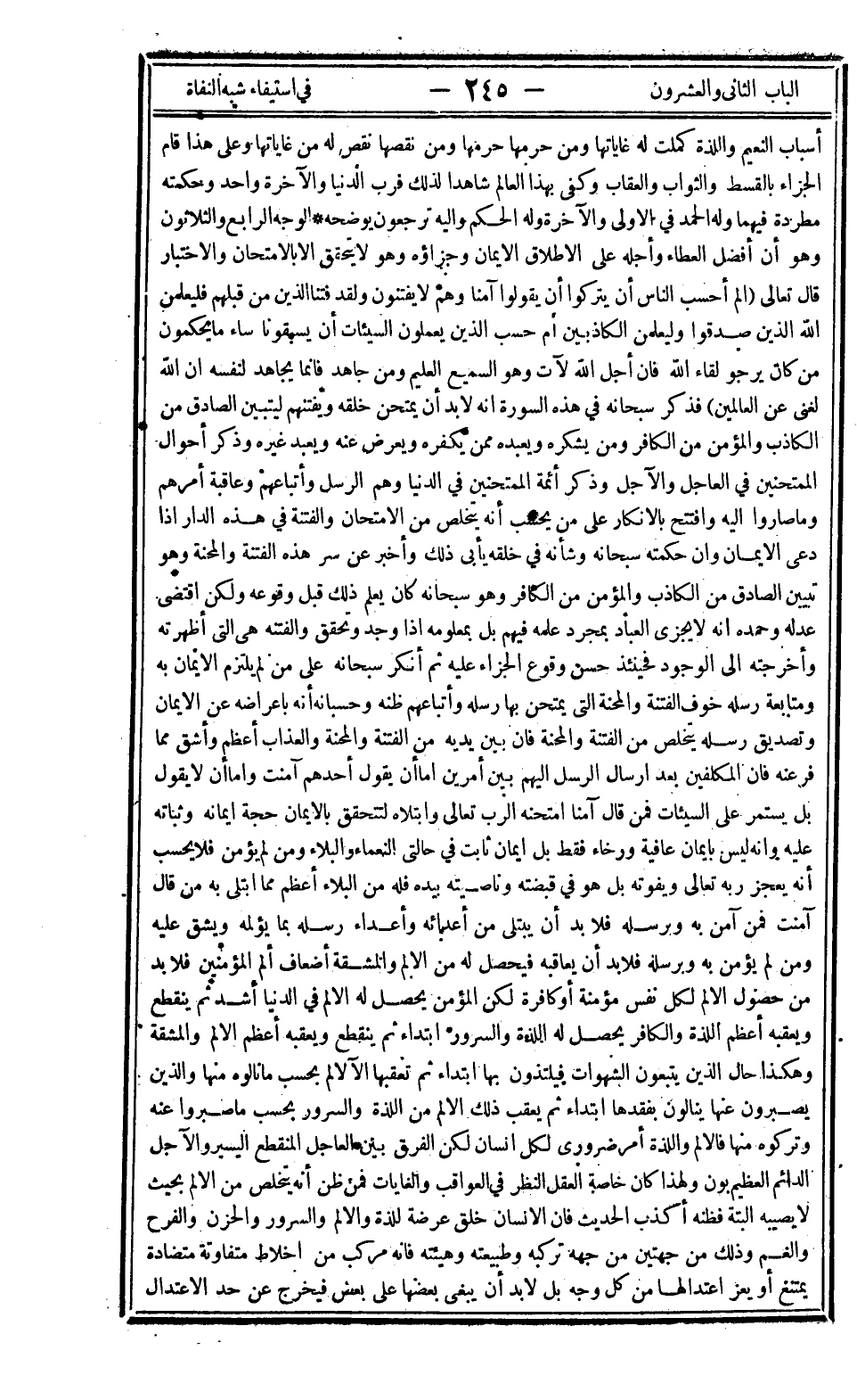 أسباب النعيم واللذة كملت له غاياتها ومن حرمها حرمها ومن نقصها نقص له من غاياتها وعلى هذا قام الجزاء بالقسط والثواب والعقاب وكفى بهذا العالم شاهدا لذلك فرب الدنيا والآخرة واحد وحكمته مطردة فيهما وله الحمد في الأولى والآخرة وله الحكم وإليه ترجعون يوضحه، الوجه الرابع والثلاثون وهو أن أفضل العطاء وأجله على الإطلاق الإيمان وجزاؤه وهو لا يتحقق إلا بالامتحان والاختبار قال تعالى: {ألم أَحَسِبَ النَّاسُ أَنْ يُتْرَكُوا أَنْ يَقُولُوا آمَنَّا وَهُمْ لا يُفْتَنُونَ وَلَقَدْ فَتَنَّا الَّذِينَ مِنْ قَبْلِهِمْ فَلَيَعْلَمَنَّ اللَّهُ الَّذِينَ صَدَقُوا وَلَيَعْلَمَنَّ الْكَاذِبِينَ أَمْ حَسِبَ الَّذِينَ يَعْمَلُونَ السَّيِّئَاتِ أَنْ يَسْبِقُونَا سَاءَ مَا يَحْكُمُونَ مَنْ كَانَ يَرْجُو لِقَاءَ اللَّهِ فَإِنَّ أَجَلَ اللَّهِ لَآتٍ وَهُوَ السَّمِيعُ الْعَلِيمُ وَمَنْ جَاهَدَ فَإِنَّمَا يُجَاهِدُ لِنَفْسِهِ إِنَّ اللَّهَ لَغَنِيٌّ عَنِ الْعَالَمِينَ} فذكر سبحانه في هذه السورة أنه لا بد أن يمتحن خلقه ويفتنهم ليتبين الصادق من الكاذب والمؤمن من الكافر ومن يشكره ويعبده ممن يكفره ويعرض عنه ويعبد غيره وذكر أحوال الممتحنين في العاجل والآجل وذكر أئمة الممتحنين في الدنيا وهم الرسل وأتباعهم وعاقبة أمرهم وما صاروا إليه وافتتح بالإنكار على من يحسب أنه يتخلص من الامتحان والفتنة في هذه الدار إذا دعى الإيمان وأن حكمته سبحانه وشأنه في خلقه يأبى ذلك وأخبر عن سر هذه الفتنة والمحنة وهو تبيين الصادق من الكاذب والمؤمن من الكافر وهو سبحانه كان يعلم ذلك قبل وقوعه ولكن اقتضى عدله وحمده أنه لا يجزي العباد بمجرد علمه فيهم بل بمعلومه إذا وجد وتحقق والفتنة هي التي أظهرته وأخرجته إلى الوجود فحينئذ حسن وقوع الجزاء عليه ثم أنكر سبحانه على من لم يلتزم الإيمان به ومتابعة رسله خوف الفتنة والمحنة التي يمتحن بها رسله وأتباعهم ظنه وحسبانه أنه بإعراضه عن الإيمان وتصديق رسله يتخلص من الفتنة والمحنة فإن بين يديه من الفتنة والمحنة والعذاب أعظم وأشق مما فر عنه فإن المكلفين بعد إرسال الرسل إليهم بين أمرين إما أن يقول أحدهم آمنت وإما أن لا يقول بل يستمر على السيئات فمن قال آمنا امتحنه الرب تعالى وابتلاه لتتحقق بالإيمان حجة إيمانه وثباته عليه وأنه ليس بإيمان عافية ورخاء فقط بل إيمان ثابت في حالتي النعماء والبلاء ومن لم يؤمن فلا يحسب أنه يعجز ربه تعالى ويفوته بل هو في قبضته وناصيته بيده فله من البلاء أعظم مما ابتلى به من قال آمنت فمن آمن به وبرسله فلا بد أن يبتلي من أعدائه وأعداء رسله بما يؤلمه ويشق عليه ومن لم يؤمن به وبرسله فلا بد أن يعاقبه فيحصل له من الألم والمشقة أضعاف ألم المؤمنين فلا بد من حصول الألم لكل نفس مؤمنة أو كافرة لكن المؤمن يحصل له الألم في الدنيا أشد ثم ينقطع ويعقبه أعظم اللذة والكافر يحصل له اللذة والسرور ابتداء ثم ينقطع ويعقبه أعظم الألم والمشقة وهكذا حال الذين يتبعون الشهوات فيلتذون بها ابتداء ثم تعقبها الآلام لم بحسب ما نالوه منها والذين يصبرون عنها ينالون بفقدها ابتداء ثم يعقب ذلك الألم من اللذة والسرور بحسب ما صبروا عنه وتركوه منها فالألم واللذة أمر ضروري لكل إنسان لكن الفرق بين العاجل المنقطع اليسير والآجل الدائم العظيم بون ولهذا كان خاصة العقل النظر في العواقب والغايات فمن ظن أنه يتخلص من الألم بحيث لا يصيبه البتة فظنه أكذب الحديث فإن الإنسان خلق عرضة للذة والألم والسرور والحزن والفرح والغم وذلك من جهتين من جهة تركبه وطبيعته وهيئته فإنه مركب من أخلاط متفاوتة متضادة يمتنع أو يعز اعتدالها من كل وجه بل لا بد أن يبغي بعضها على بعض فيخرج عن حد الاعتدال