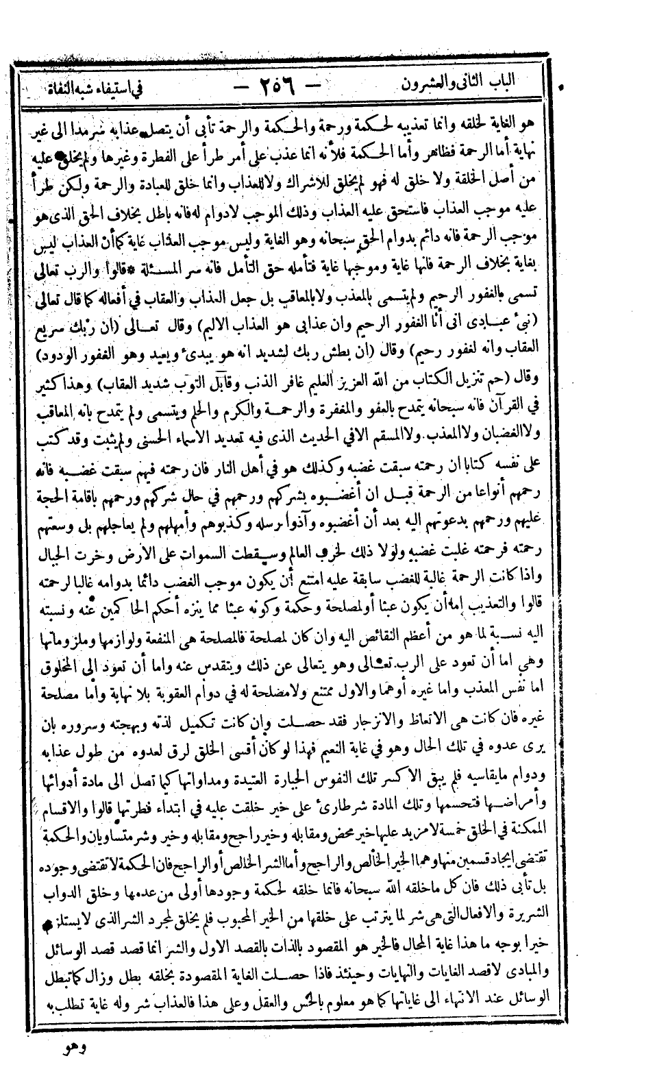 هو الغاية لخلقه وإنما تعذيبه لحكمة ورحمة والحكمة والرحمة تأبى أن يتصل عذابه سرمدا إلى غير نهاية أما الرحمة فظاهر وأما الحكمة فلأنه إنما عذب على أمر طرأ على الفطرة وغيرها ولم يخلق عليه من أصل الخلقة ولا خلق له فهو لم يخلق للإشراك ولا للعذاب وإنما خلق للعبادة والرحمة ولكن طرأ عليه موجب العذاب فاستحق عليه العذاب وذلك الموجب لا دوام له فإنه باطل بخلاف الحق الذي هو موجب الرحمة فإنه دائم بدوام الحق سبحانه وهو الغاية وليس موجب العذاب غاية كما أن العذاب ليس بغاية بخلاف الرحمة فإنها غاية وموجبها غاية فتأمله حق التأمل فإنه سر المسألة، قالوا والرب تعالى تسمى بالغفور الرحيم ولم يتسمى بالمعذب ولا بالمعاقب بل جعل العذاب والعقاب في أفعاله كما قال تعالى: {نَبِّئْ عِبَادِي أَنِّي أَنَا الْغَفُورُ الرَّحِيمُ وَأَنَّ عَذَابِي هُوَ الْعَذَابُ الْأَلِيمُ} وقال تعالى: {نَّ رَبَّكَ سَرِيعُ الْعِقَابِ وَإِنَّهُ لَغَفُورٌ رَحِيمٌ} وقال: {إِنَّ بَطْشَ رَبِّكَ لَشَدِيدٌ إِنَّهُ هُوَ يُبْدِئُ وَيُعِيدُ وَهُوَ الْغَفُورُ الْوَدُودُ} وقال: {حم تَنْزِيلُ الْكِتَابِ مِنَ اللَّهِ الْعَزِيزِ الْعَلِيمِ غَافِرِ الذَّنْبِ وَقَابِلِ التَّوْبِ شَدِيدِ الْعِقَابِ} وهذا كثير في القرآن فإنه سبحانه يتمدح بالعفو والمغفرة والرحمة والكرم والحلم ويتسمى ولم يتمدح بأنه المعاقب ولا الغضبان ولا المعذب ولا المسقم إلا في الحديث الذي فيه تعديد الأسماء الحسنى ولم يثبت وقد كتب على نفسه كتابا أن رحمته سبقت غضبه وكذلك هو في أهل النار فإن رحمته فيهم سبقت غضبه فإنه رحمهم أنواعا من الرحمة قبل أن أغضبوه بشركهم ورحمهم في حال شركهم ورحمهم بإقامة الحجة عليهم ورحمهم بدعوتهم إليه بعد أن أغضبوه وآذوا رسله وكذبوهم وأمهلهم ولم يعاجلهم بل وسعتهم رحمته فرحمته غلبت غضبه ولولا ذلك لخرب العالم وسقطت السماوات على الأرض وخرت الجبال وإذا كانت الرحمة غالبة للغضب سابقة عليه امتنع أن يكون موجب الغضب دائما بدوامه غالبا لرحمته قالوا والتعذيب إما أن يكون عبثا أو لمصلحة وحكمة وكونه عبثا مما ينزه أحكم الحاكمين عنه ونسبته إليه نسبة لما هو من أعظم النقائص إليه وإن كان لمصلحة فالمصلحة هي المنفعة ولوازمها وملزوماتها وهي إما أن تعود على الرب تعالى وهو يتعالى عن ذلك ويتقدس عنه وإما أن تعود إلى المخلوق إما نفس المعذب وإما غيره أوهما والأول ممتنع ولا مصلحة له في دوام العقوبة بلا نهاية وأما مصلحة غيره فإن كانت هي الاتعاظ والانزجار فقد حصلت وإن كانت تكميل لذته وبهجته وسروره بأن يرى عدوه في تلك الحال وهو في غاية النعيم فهذا لو كان أقسى الخلق لرق لعدوه من طول عذابه ودوام ما يقاسيه فلم يبق إلا كسر تلك النفوس الجبارة العتيدة ومداواتها كيما تصل إلى مادة أدوائها وأمراضها فتحسمها وتلك المادة شر طارئ على خير خلقت عليه في ابتداء فطرتها قالوا والأقسام الممكنة في الخلق خمسة لا مزيد عليها خير محض ومقابله وخير راجح ومقابله وخير وشر متساويان والحكمة تقتضي إيجاد قسمين منها وهما الخير الخالص والراجح وأما الشر الخالص أو الراجح فإن الحكمة لا تقتضي وجوده بل تأبى ذلك فإن كل ما خلقه الله سبحانه فإنما خلقه لحكمة وجودها أولى من عدمها وخلق الدواب الشريرة والأفعال التي هي شر لما يترتب على خلقها من الخير المحبوب فلم يخلق لمجرد الشر الذي لا يستلزم خيرا بوجه ما هذا غاية المحال فالخير هو المقصود بالذات بالقصد الأول والشر إنما قصد قصد الوسائل والمبادئ لا قصد الغايات والنهايات وحينئذ فإذا حصلت الغاية المقصودة بخلقه بطل وزال كما تبطل الوسائل عند الانتهاء إلى غاياتها كما هو معلوم بالحس والعقل وعلى هذا فالعذاب شر وله غاية تطلب به