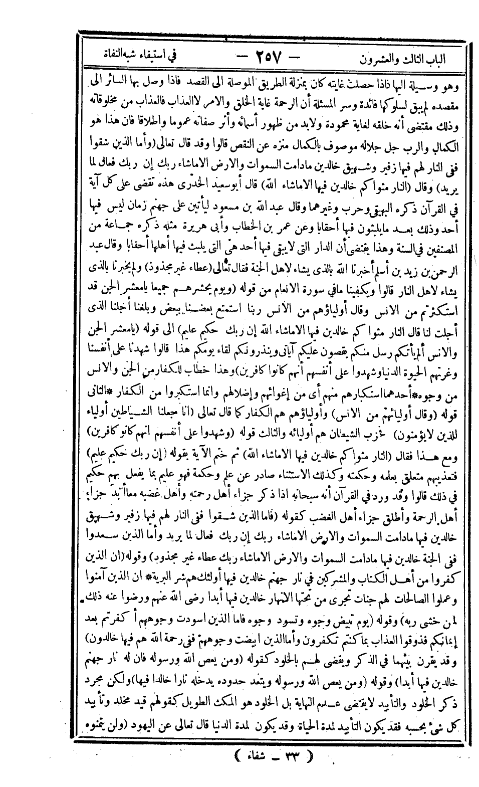 وهو وسيلة إليها فإذا حصلت غايته كان بمنزلة الطريق الموصلة إلى القصد فإذا وصل بها السائر إلى مقصده لم يبق لسلوكها فائدة وسر المسألة أن الرحمة غاية الخلق والأمر لا العذاب فالعذاب من مخلوقاته وذلك مقتضى أنه خلقه لغاية محمودة ولا بد من ظهور أسمائه وأثر صفاته عموما وإطلاقا فإن هذا هو الكمال والرب جل جلاله موصوف بالكمال منزه عن النقص قالوا وقد قال تعالى: {فَأَمَّا الَّذِينَ شَقُوا فَفِي النَّارِ لَهُمْ فِيهَا زَفِيرٌ وَشَهِيقٌ خَالِدِينَ فِيهَا مَا دَامَتِ السَّمَاوَاتُ وَالْأَرْضُ إِلَّا مَا شَاءَ رَبُّكَ إِنَّ رَبَّكَ فَعَّالٌ لِمَا يُرِيدُ} وقال: {النَّارُ مَثْوَاكُمْ خَالِدِينَ فِيهَا إِلَّا مَا شَاءَ اللَّهُ} قال أبو سعيد الخدري: "هذه تقضي على كل آية في القرآن" ذكره البيهقي وحرب وغيرهما وقال عبد الله بن مسعود: "ليأتين على جهنم زمان ليس فيها أحد وذلك بعد ما يلبثون فيها أحقابا" وعن عمر بن الخطاب وأبي هريرة مثله ذكره جماعة من المصنفين في السنة وهذا يقتضي أن الدار التي لا يبقى فيها أحد هي التي يلبث فيها أهلها أحقابا وقال عبد الرحمن بن زيد بن أسلم: "أخبرنا الله بالذي يشاء لأهل الجنة فقال تعالى: {عَطَاءً غَيْرَ مَجْذُوذٍ} ولم يخبرنا بالذي يشاء لأهل النار" قالوا ويكفينا ما في سورة الأنعام من قوله: {وَيَوْمَ يَحْشُرُهُمْ جَمِيعاً يَا مَعْشَرَ الْجِنِّ قَدِ اسْتَكْثَرْتُمْ مِنَ الْأِنْسِ وَقَالَ أَوْلِيَاؤُهُمْ مِنَ الْأِنْسِ رَبَّنَا اسْتَمْتَعَ بَعْضُنَا بِبَعْضٍ وَبَلَغْنَا أَجَلَنَا الَّذِي أَجَّلْتَ لَنَا قَالَ النَّارُ مَثْوَاكُمْ خَالِدِينَ فِيهَا إِلَّا مَا شَاءَ اللَّهُ إِنَّ رَبَّكَ حَكِيمٌ عَلِيمٌ} إلى قوله: {امَعْشَرَ الْجِنِّ وَالْأِنْسِ أَلَمْ يَأْتِكُمْ رُسُلٌ مِنْكُمْ يَقُصُّونَ عَلَيْكُمْ آيَاتِي وَيُنْذِرُونَكُمْ لِقَاءَ يَوْمِكُمْ هَذَا قَالُوا شَهِدْنَا عَلَى أَنْفُسِنَا وَغَرَّتْهُمُ الْحَيَاةُ الدُّنْيَا وَشَهِدُوا عَلَى أَنْفُسِهِمْ أَنَّهُمْ كَانُوا كَافِرِينَ} وهذا خطاب للكفار من الجن والإنس من وجوه، أحدها استكبارهم منهم أي من إغوائهم وإضلالهم وإنما استكبروا من الكفار، الثاني قوله: {وَقَالَ أَوْلِيَاؤُهُمْ مِنَ الْأِنْسِ} وأولياؤهم هم الكفار كما قال تعالى: {إنا جعلنا الشياطين أولياء للذين لا يؤمنون} فحزب الشيطان هم أولياؤه والثالث قوله: {إِنَّا جَعَلْنَا الشَّيَاطِينَ أَوْلِيَاءَ لِلَّذِينَ لا يُؤْمِنُونَ} ومع هذا فقال: {لنَّارُ مَثْوَاكُمْ خَالِدِينَ فِيهَا إِلَّا مَا شَاءَ اللَّهُ} ثم ختم الآية بقوله: {إِنَّ رَبَّكَ حَكِيمٌ عَلِيمٌ} فتعذيبهم متعلق بعلمه وحكمته وكذلك الاستثناء صادر عن علم وحكمة فهو عليم بما يفعل بهم حكيم في ذلك قالوا وقد ورد في القرآن أنه سبحانه إذا ذكر جزاء أهل رحمته وأهل غضبه معا أبّد جزاء أهل الرحمة وأطلق جزاء أهل الغضب كقوله: {فَأَمَّا الَّذِينَ شَقُوا فَفِي النَّارِ لَهُمْ فِيهَا زَفِيرٌ وَشَهِيقٌ خَالِدِينَ فِيهَا مَا دَامَتِ السَّمَاوَاتُ وَالْأَرْضُ إِلَّا مَا شَاءَ رَبُّكَ إِنَّ رَبَّكَ فَعَّالٌ لِمَا يُرِيدُ َأَمَّا الَّذِينَ سُعِدُوا فَفِي الْجَنَّةِ خَالِدِينَ فِيهَا مَا دَامَتِ السَّمَاوَاتُ وَالْأَرْضُ إِلَّا مَا شَاءَ رَبُّكَ عَطَاءً غَيْرَ مَجْذُوذٍ} وقوله: {نَّ الَّذِينَ كَفَرُوا مِنْ أَهْلِ الْكِتَابِ وَالْمُشْرِكِينَ فِي نَارِ جَهَنَّمَ خَالِدِينَ فِيهَا أُولَئِكَ هُمْ شَرُّ الْبَرِيَّةِ إِنَّ الَّذِينَ آمَنُوا وَعَمِلُوا الصَّالِحَاتِ أُولَئِكَ هُمْ خَيْرُ الْبَرِيَّةِ جَزَاؤُهُمْ عِنْدَ رَبِّهِمْ جَنَّاتُ عَدْنٍ تَجْرِي مِنْ تَحْتِهَا الْأَنْهَارُ خَالِدِينَ فِيهَا أَبَداً رَضِيَ اللَّهُ عَنْهُمْ وَرَضُوا عَنْهُ ذَلِكَ لِمَنْ خَشِيَ رَبَّهُ} وقوله: {يَوْمَ تَبْيَضُّ وُجُوهٌ وَتَسْوَدُّ وُجُوهٌ فَأَمَّا الَّذِينَ اسْوَدَّتْ وُجُوهُهُمْ أَكَفَرْتُ
