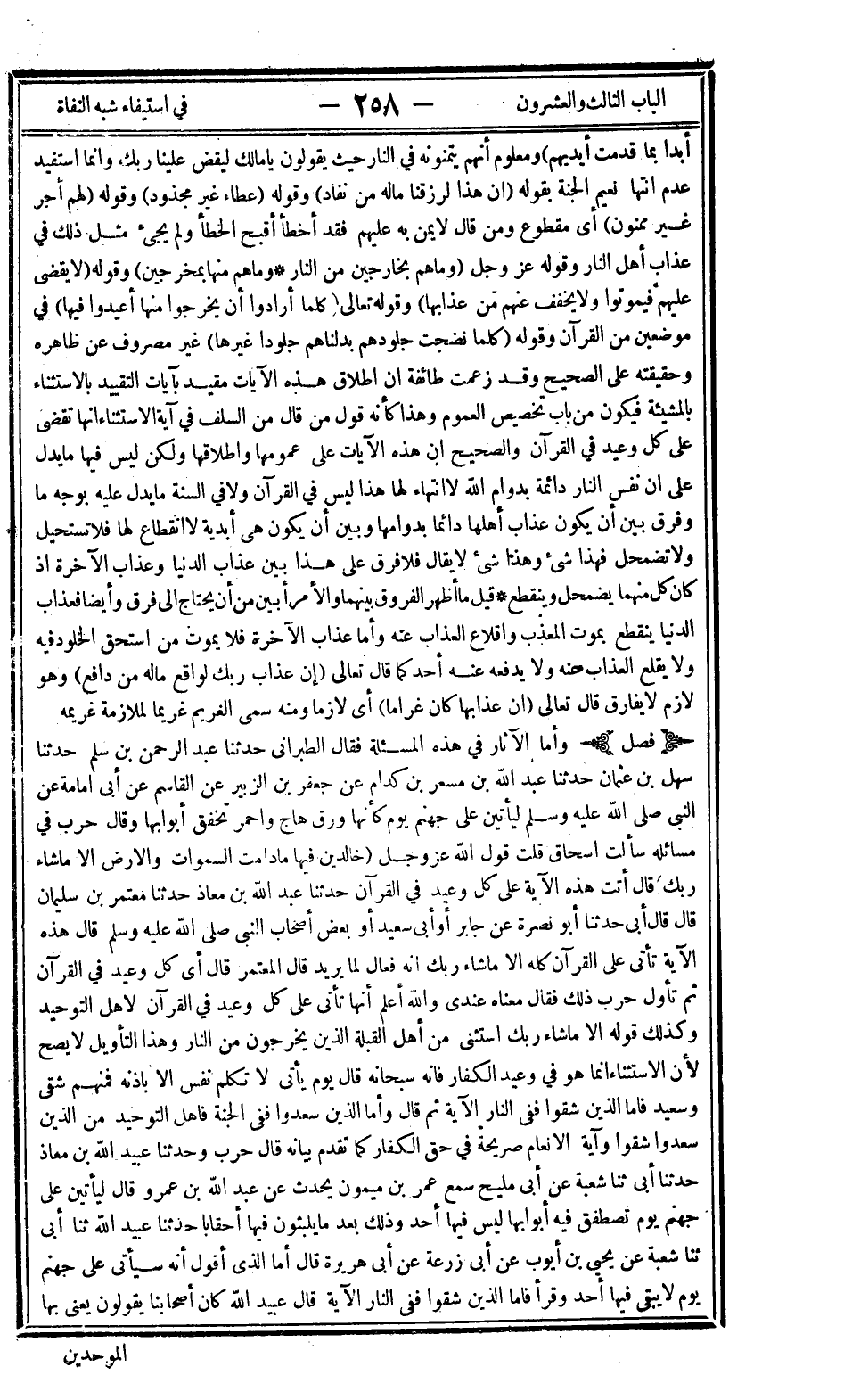 فصل: وأما الآثار في هذه المسألة فقال الطبراني حدثنا عبد الرحمن بن سلم حدثنا سهل بن عثمان حدثنا عبد الله بن مسعر بن كدام عن جعفر بن الزبير عن القاسم عن أبي أمامة عن النبي صلى الله عليه وسلم: "ليأتين على جهنم يوم كأنها ورق هاج واحمر تخفق أبوابها" وقال حرب في مسائله: "سألت إسحاق قلت قول الله عز وجل: {خَالِدِينَ فِيهَا مَا دَامَتِ السَّمَاوَاتُ وَالْأَرْضُ إِلَّا مَا شَاءَ رَبُّكَ} قال: أتت هذه الآية على كل وعيد في القرآن" حدثنا عبد الله بن معاذ حدثنا معتمر بن سليمان قال قال أبي حدثنا أبو نصرة عن جابر أو أبي سعيد أو بعض أصحاب النبي صلى الله عليه وسلم قال: هذه الآية تأتي على القرآن كله إلا ما شاء ربك إنه فعال لما يريد قال المعتمر: "قال أي كل وعيد في القرآن" ثم تأول حرب ذلك فقال: "معناه عندي والله أعلم أنها تأتي على كل وعيد في القرآن لأهل التوحيد وكذلك قوله إلا ما شاء ربك استثنى من أهل القبلة الذين يخرجون من النار" وهذا التأويل لا يصح لأن الاستثناء إنما هو في وعيد الكفار فإنه سبحانه قال: {يَوْمَ يَأْتِ لا تَكَلَّمُ نَفْسٌ إِلَّا بِإِذْنِهِ فَمِنْهُمْ شَقِيٌّ وَسَعِيدٌ فَأَمَّا الَّذِينَ شَقُوا فَفِي النَّارِ} الآية ثم قال: {وَأَمَّا الَّذِينَ سُعِدُوا فَفِي الْجَنَّةِ} فأهل التوحيد من الذين سعدوا شقوا وآية الأنعام صريحة في حق الكفار كما تقدم بيانه قال حرب وحدثنا عبيد الله بن معاذ حدثنا أبي ثنا شعبة عن أبي حدثنا مليح سمع عمر بن ميمون يحدث عن عبد الله بن عمرو قال: "ليأتين على جهنم يوم تصطفق فيه أبوابها ليس فيها أحد وذلك بعدما يلبثون فيها أحقابا" حدثنا عبيد الله ثنا أبي ثنا شعبة عن يحيى بن أيوب عن أبي زرعة عن أبي هريرة قال: "أما الذي أقول أنه سيأتي على جهنم يوم لا يبقى فيها أحد وقرأ فأما الذين شقوا ففي النار" الآية قال عبيد الله: "كان أصحابنا يقولون يعني بها