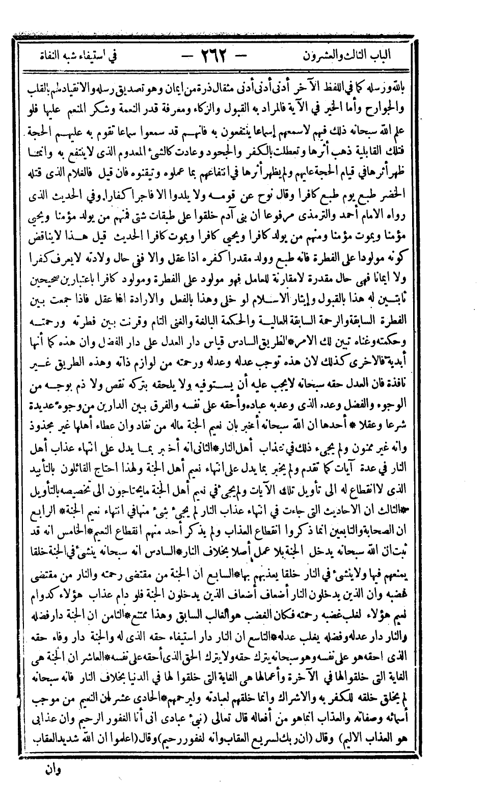 بالله ورسله كما في اللفظ الآخر أدنى أدنى أدنى مثقال ذرة من إيمان وهو تصديق رسله والانقياد لهم بالقلب والجوارح وأما الخير في الآية فالمراد به القبول والزكاة ومعرفة قدر النعمة وشكر المنعم عليها فلو علم الله سبحانه ذلك فيهم لأسمعهم إسماعا ينتفعون به فإنهم قد سمعوا سماعا تقوم به عليهم الحجة فتلك القابلية ذهب أثرها وتعطلت بالكفر والجحود وعادت كالشيء المعدوم الذي لا ينتفع به وإنما ظهر أثرها في قيام الحجة عليهم ولم يظهر أثرها في انتفاعهم بما عملوه وتيقنوه فإن قيل فالغلام الذي قتله الخضر طبع يوم طبع كافرا وقال نوح عن قومه ولا يلدوا إلا فاجرا كفارا وفي الحديث الذي رواه الإمام أحمد والترمذي مرفوعا: "إن بني آدم خلقوا على طبقات شتى فمنهم من يولد مؤمنا ويحيي مؤمنا ويموت مؤمنا ومنهم من يولد كافرا ويحي كافرا ويموت كافرا" الحديث قيل هذا لا يناقض كونه مولودا على الفطرة فإنه طبع وولد مقدرا كفره إذا عقل وإلا ففي حال ولادته لا يعرف كفرا ولا إيمانا فهي حال مقدرة لا مقارنة للعامل فهو مولود على الفطرة ومولود كافرا باعتبارين صحيحين ثابتين له هذا بالقبول وإيثار الإسلام لو خلى وهذا بالفعل والإرادة إذا عقل فإذا جمعت بين الفطرة السابقة والرحمة السابقة العالية والحكمة البالغة والغنى التام وقرنت بين فطرته ورحمته وحكمته وغناه تبين لك الأمر، الطريق السادس قياس دار العدل على دار الفضل وأن هذه كما أنها أبدية فالأخرى كذلك لأن هذه توجب عدله وعدله ورحمته من لوازم ذاته وهذه الطريق غير نافذة فإن العدل حقه سبحانه لا يجب عليه أن يستوفيه ولا يلحقه بتركه نقص ولا ذم بوجه من الوجوه والفضل وعده الذي وعد به عباده وأحقه على نفسه والفرق بين الدارين من وجوه عديدة شرعا وعقلا، أحدها أن الله سبحانه أخبر بأن نعيم الجنة ماله من نفاد وأن عطاء أهلها غير مجذوذ وأنه غير ممنون ولم يجيء ذلك في عذاب أهل النار، الثاني أنه أخبر بما يدل على انتهاء عذاب أهل النار في عدة آيات كما تقدم ولم يخبر بما يدل على انتهاء نعيم أهل الجنة ولهذا احتاج القائلون بالتأبيد الذي لا انقطاع له إلى تأويل تلك الآيات ولم يجئ في نعيم أهل الجنة ما يحتاجونه إلى تخصيصه بالتأويل، الثالث أن الأحاديث التي جاءت في انتهاء عذاب النار لم يجيء شيء منها في انتهاء نعيم الجنة، الرابع أن الصحابة والتابعين إنما ذكروا انقطاع العذاب ولم يذكر أحد منهم انقطاع النعيم، الخامس أنه قد ثبت أن الله سبحانه يدخل الجنة بلا عمل أصلا بخلاف النار، السادس أنه سبحانه ينشئ في الجنة خلقا ينعمهم فيها ولا ينشئ في النار خلقا يعذبهم بها، السابع أن الجنة من مقتضى رحمته والنار من مقتضى غضبه وأن الذين يدخلون النار أضعاف أضعاف الذين يدخلون الجنة فلو دام عذاب هؤلاء كدوام نعيم هؤلاء لغلب غضبه رحمته فكان الغضب هو الغالب السابق وهذا ممتنع، الثامن أن الجنة دار فضله والنار دار عدله وفضله يغلب عدله، التاسع أن النار دار استيفاء حقه الذي له والجنة دار وفاء حقه الذي أحقه هو على نفسه وهو سبحانه يترك حقه ولا يترك الحق الذي أحقه على نفسه، العاشر أن الجنة هي الغاية التي خلقوا لها في الآخرة وأعمالها هي الغاية التي خلقوا لها في الدنيا بخلاف النار فإنه سبحانه لم يخلق خلقه للكفر به والإشراك وإنما خلقهم لعبادته وليرحمهم، الحادي عشر أن النعيم من موجب أسمائه وصفاته والعذاب إنما هو من أفعاله قال تعالى: {نَبِّئْ عِبَادِي أَنِّي أَنَا الْغَفُورُ الرَّحِيمُ وَأَنَّ عَذَابِي هُوَ الْعَذَابُ الأَلِيمُ} وقال: {إِنَّ رَبَّكَ لَسَرِيعُ الْعِقَابِ وَإِنَّهُ لَغَفُورٌ رَحِيمٌ} وقال: {اعْلَمُوا أَنَّ اللَّهَ شَدِيدُ الْعِقَابِ