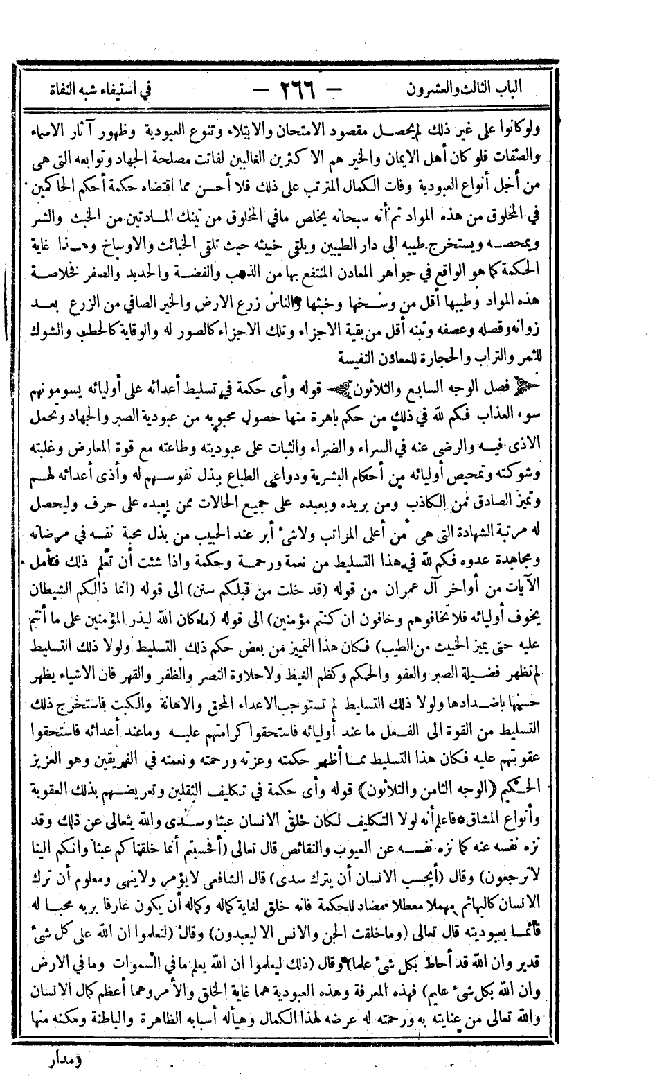 فصل: الوجه السابع والثلاثون قوله وأي حكمة في تسليط أعدائه على أوليائه يسومونهم سوء العذاب فكم لله في ذلك من حكم باهرة منها حصول محبوبة من عبودية الصبر والجهاد وتحمل الأذى فيه والرضى عنه في السراء والضراء والثبات على عبوديته وطاعته مع قوة المعارض وغلبته وشوكته وتمحيص أوليائه من أحكام البشرية ودواعي الطباع ببذل نفوسهم له وأذى أعدائه لهم وتميز الصادق من الكاذب ومن يريده ويعبده على جميع الحالات ممن يعبده على حرف وليحصل له مرتبة الشهادة التي هي من أعلى المراتب ولا شيء أبر عند الحبيب من بذل محبة نفسه في مرضاته ومجاهدة عدوه فكم لله في هذا التسليط من نعمة ورحمة وحكمة وإذا شئت أن تعلم ذلك فتأمل الآيات من أواخر آل عمران من قوله: {قَدْ خَلَتْ مِنْ قَبْلِكُمْ سُنَنٌ} إلى قوله: {نَّمَا ذَلِكُمُ الشَّيْطَانُ يُخَوِّفُ أَوْلِيَاءَهُ فَلا تَخَافُوهُمْ وَخَافُونِ إِنْ كُنْتُمْ مُؤْمِنِينَ} إلى قوله: {مَا كَانَ اللَّهُ لِيَذَرَ الْمُؤْمِنِينَ عَلَى مَا أَنْتُمْ عَلَيْهِ حَتَّى يَمِيزَ الْخَبِيثَ مِنَ الطَّيِّبِ} فكان هذا التمييز من بعض حكم ذلك التسليط ولولا ذلك التسليط لم تظهر فضيلة الصبر والعفو والحكم وكظم الغيظ ولا حلاوة النصر والظفر والقهر فإن الأشياء يظهر حسنها بأضدادها ولولا ذلك التسليط لم تستوجب الأعداء المحق والإهانة والكبت فاستخرج ذلك التسليط من القوة إلى الفعل ما عند أوليائه فاستحقوا كرامتهم عليه وما عند أعدائه فاستحقوا عقوبتهم عليه فكان هذا التسليط مما أظهر حكمته وعزته ورحمته ونعمته في الفريقين وهو العزيز الحكيم، الوجه الثامن والثلاثون قوله وأي حكمة في تكليف الثقلين وتعريضهم بذلك العقوبة وأنواع المشاق، فاعلم أنه لولا التكليف لكان خلق الإنسان عبثا وسدى والله يتعالى عن ذلك وقد نزه نفسه عنه كما نزه نفسه عن العيوب والنقائص قال تعالى: {أَفَحَسِبْتُمْ أَنَّمَا خَلَقْنَاكُمْ عَبَثاً وَأَنَّكُمْ إِلَيْنَا لا تُرْجَعُونَ} وقال: {أَيَحْسَبُ الْأِنْسَانُ أَنْ يُتْرَكَ سُدىً} قال الشافي لا يؤمر ولا ينهى ومعلوم أن ترك الإنسان كالبهائم مهملا معطلا مضاد للحكمة فإنه خلق لغاية كماله وكماله أن يكون عارفا بربه محبا له قائما بعبوديته قال تعالى: {وَمَا خَلَقْتُ الْجِنَّ وَالْأِنْسَ إِلَّا لِيَعْبُدُونِ} وقال: {لِتَعْلَمُوا أَنَّ اللَّهَ عَلَى كُلِّ شَيْءٍ قَدِيرٌ وَأَنَّ اللَّهَ قَدْ أَحَاَطَ بِكُلِّ شَيْءٍ عِلْماً} وقال: {ذَلِكَ لِتَعْلَمُوا أَنَّ اللَّهَ يَعْلَمُ مَا فِي السَّمَاوَاتِ وَمَا فِي الْأَرْضِ وَأَنَّ اللَّهَ بِكُلِّ شَيْءٍ عَلِيمٌ} فهذه المعرفة وهذه العبودية هما غاية الخلق والأمر وهما أعظم كمال الإنسان والله تعالى من عنايته به ورحمته له عرضه لهذا الكمال وهيأ له أسبابه الظاهرة والباطنة ومكنه منها