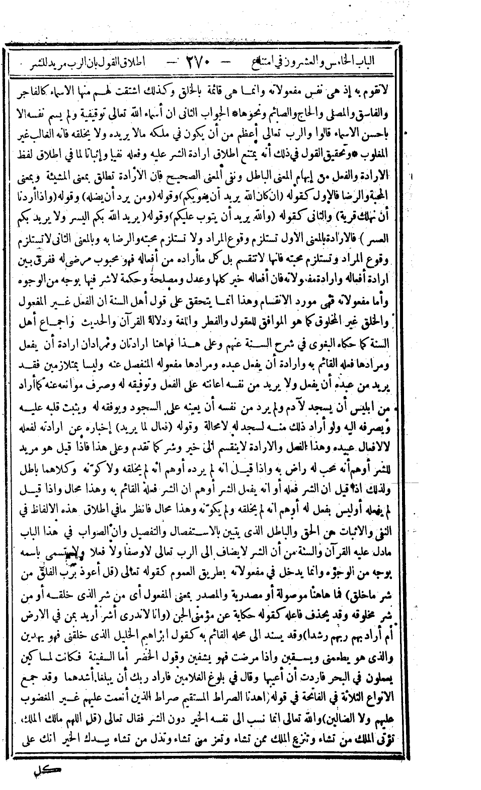 لا تقوم به إذ هي نفس مفعولاته وإنما هي قائمة بالخلق وكذلك اشتقت لهم منها الأسماء كالفاجر والفاسق والمصلي والحاج والصائم ونحوها، الجواب الثاني أن أسماء الله تعالى توقيفية ولم يسم نفسه إلا بأحسن الأسماء قالوا والرب تعالى أعظم من أن يكون في ملكه مالا يريده ولا يخلقه فإنه الغالب غير المغلوب، وتحقيق القول في ذلك أنه يمتنع إطلاق إرادة الشر عليه وفعله نفيا وإثباتا في إطلاق لفظ الإرادة والفعل من إبهام المعنى الباطل ونفي المعنى الصحيح فإن الإرادة تطلق بمعنى المشيئة وبمعنى المحبة والرضا فالأول كقوله: {إِنْ كَانَ اللَّهُ يُرِيدُ أَنْ يُغْوِيَكُمْ} وقوله: {وَمَنْ يُرِدْ أَنْ يُضِلَّهُ} وقوله: {وَإِذَا أَرَدْنَا أَنْ نُهْلِكَ قَرْيَةً} والثاني كقوله: {وَاللَّهُ يُرِيدُ أَنْ يَتُوبَ عَلَيْكُمْ} وقوله: {يُرِيدُ اللَّهُ بِكُمُ الْيُسْرَ وَلا يُرِيدُ بِكُمُ الْعُسْرَ} فالإرادة بالمعنى الأول تستلزم وقوع المراد ولا تستلزم محبته والرضا به وبالمعنى الثاني لا تستلزم وقوع المراد وتستلزم محبته فإنها لا تنقسم بل كل ما أراده من أفعاله فهو محبوب مرضي له ففرق بين إرادة أفعاله وإرادة مفعولاته فإن أفعاله خير كلها وعدل ومصلحة وحكمة لا شر فيها بوجه من الوجوه وأما مفعولاته فهي مورد الانقسام وهذا إنما يتحقق على قول أهل السنة أن الفعل غير المفعول والخلق غير المخلوق كما هو الموافق للعقول والفطر واللغة ودلالة القرآن والحديث وإجماع أهل السنة كما حكاه البغوي في شرح السنة عنهم وعلى هذا فهاهنا إرادتان ومرادان إرادة أن يفعل ومرادها فعله القائم به وإرادة أن يفعل عبده ومرادها مفعوله المنفصل عنه وليسا بمتلازمين فقد يريد من عبده أن يفعل ولا يريد من نفسه إعانته على الفعل وتوفيقه له وصرف موانعه عنه كما أراد من إبليس أن يسجد لآدم ولم يرد من نفسه أن يعينه على السجود ويوفقه له ويثبت قلبه عليه ويصرفه إليه ولو أراد ذلك منه لسجد له لا محالة وقوله: {فَعَّالٌ لِمَا يُرِيدُ} إخباره عن إرادته لفعله لا لأفعال عبيده وهذا الفعل والإرادة لا ينقسم إلى خير وشر كما تقدم وعلى هذا فإذا قيل هو مريد للشر أوهم أنه محب له راض به وإذا قيل أنه لم يرده أوهم أنه لم يخلقه ولا كونه وكلاهما باطل ولذلك إذا قيل أن الشر فعله أو أنه يفعل الشر أوهم أن الشر فعله القائم به وهذا محال وإذا قيل لم يفعله أو ليس بفعل له أوهم أنه لم يخلقه ولم يكونه وهذا محال فانظر ما في إطلاق هذه الألفاظ في النفي والإثبات من الحق والباطل الذي يتبين بالاستفصال والتفصيل وأن الصواب في هذا الباب ما دل عليه القرآن والسنة من أن الشر لا يضاف إلى الرب تعالى لا وصفا ولا فعلا ولا يتسمى باسمه بوجه من الوجوه وإنما يدخل في مفعولاته بطريق العموم كقوله تعالى: {قُلْ أَعُوذُ بِرَبِّ الْفَلَقِ مِنْ شَرِّ مَا خَلَقَ} فما هاهنا موصولة أو مصدرية والمصدر بمعنى المفعول أي من شر الذي خلقه أو من شر مخلوقه وقد يحذف فاعله كقوله حكاية عن مؤمني الجن: {وَأَنَّا لا نَدْرِي أَشَرٌّ أُرِيدَ بِمَنْ فِي الْأَرْضِ أَمْ أَرَادَ بِهِمْ رَبُّهُمْ رَشَداً} وقد يسند إلى محله القائم به كقول إبراهيم الخليل الذي خلقني فهو يهدين والذي هو يطعمني ويسقين وإذا مرضت فهو يشفين وقول الخضر أما السفينة فكانت لمساكين يعملون في البحر فأردت أن أعيبها وقال في بلوغ الغلامين فأراد ربك أن يبلغا أشدهما وقد جمع الأنواع الثلاثة في الفاتحة في قوله: {اهْدِنَا الصِّرَاطَ الْمُسْتَقِيمَ صِرَاطَ الَّذِينَ أَنْعَمْتَ عَلَيْهِمْ غَيْرِ الْمَغْضُوبِ عَلَيْهِمْ وَلا الضَّالِّينَ} والله تعالى إنما نسب إلى نفسه الخير دون الشر فقال تعالى: {قُلِ اللَّهُمَّ مَالِكَ الْمُلْكِ تُؤْتِي الْمُلْكَ مَنْ تَشَاءُ وَتَنْزِعُ الْمُلْكَ مِمَّنْ تَشَاءُ وَتُعِزُّ مَنْ تَشَاءُ وَتُذِلُّ مَنْ تَشَاءُ بِيَدِكَ الْخَيْرُ إِنَّكَ عَلَى