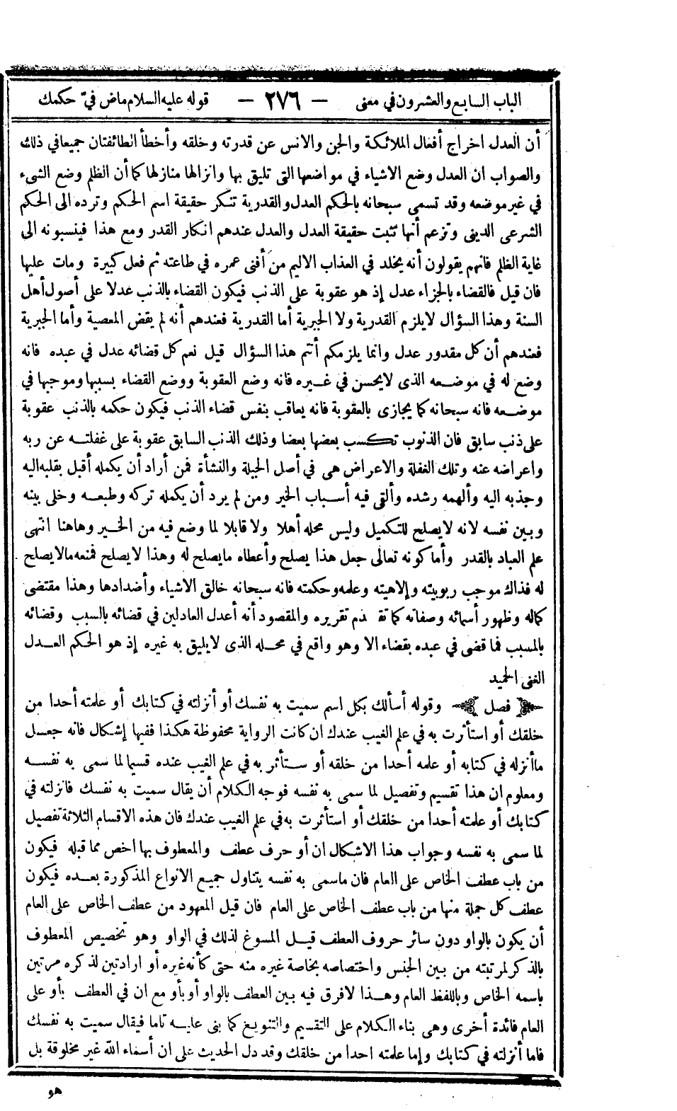 أن العدل إخراج أفعال الملائكة والجن والإنس عن قدرته وخلقه وأخطأ الطائفتان جميعا في ذلك والصواب أن العدل وضع الأشياء في مواضعها التي تليق بها وإنزالها منازلها كما أن الظلم وضع الشيء في غير موضعه وقد تسمى سبحانه بالحكم العدل والقدرية تنكر حقيقة اسم الحكم وترده إلى الحكم الشرعي الديني وتزعم أنها تثبت حقيقة العدل والعدل عندهم إنكار القدر ومع هذا فينسبونه إلى غاية الظلم فإنهم يقولون أنه يخلد في العذاب الأليم من أفنى عمره في طاعته ثم فعل كبيرة ومات عليها فإن قيل فالقضاء بالجزاء عدل إذ هو عقوبة على الذنب فيكون القضاء بالذنب عدلا على أصول أهل السنة وهذا السؤال لا يلزم القدرية ولا الجبرية أما القدرية فعندهم أنه لم يقض المعصية وأما الجبرية فعندهم أن كل مقدور عدل وإنما يلزمكم أنتم هذا السؤال قيل نعم كل قضائه عدل في عبده فإنه وضع له في موضعه الذي لا يحسن في غيره فإنه وضع العقوبة ووضع القضاء بسببها وموجبها في موضعه فإنه سبحانه كما يجازي بالعقوبة فإنه يعاقب بنفس قضاء الذنب فيكون حكمه بالذنب عقوبة على ذنب سابق فإن الذنوب تكسب بعضها بعضا وذلك الذنب السابق عقوبة على غفلته عن ربه وإعراضه عنه وتلك الغفلة والإعراض هي في أصل الجبلة والنشأة فمن أراد أن يكلمه أقبل بقلبه إليه وجذبه إليه وألهمه رشده وألقى فيه أسباب الخير ومن لم يرد أن يكمله تركه وطبعه وخلى بينه وبين نفسه لأنه لا يصلح للتكميل وليس محله أهلا ولا قابلا لما وضع فيه من الخير وها هنا انتهى علم العباد بالقدر وأما كونه تعالى جعل هذا يصلح وأعطاه ما يصلح له وهذا لا يصلح فمنعه مالا يصلح له فذاك موجب ربوبيته وإلهيته وعلمه وحكمته فإنه سبحانه خالق الأشياء وأضدادها وهذا مقتضى كماله وظهور أسمائه وصفاته كما تقدم تقريره والمقصود أنه أعدل العادلين في قضائه بالسبب وقضائه بالمسبب فما قضى في عبده بقضاء إلا وهو واقع في محله الذي لا يليق به غيره إذ هو الحكم العدل الغني الحميد.