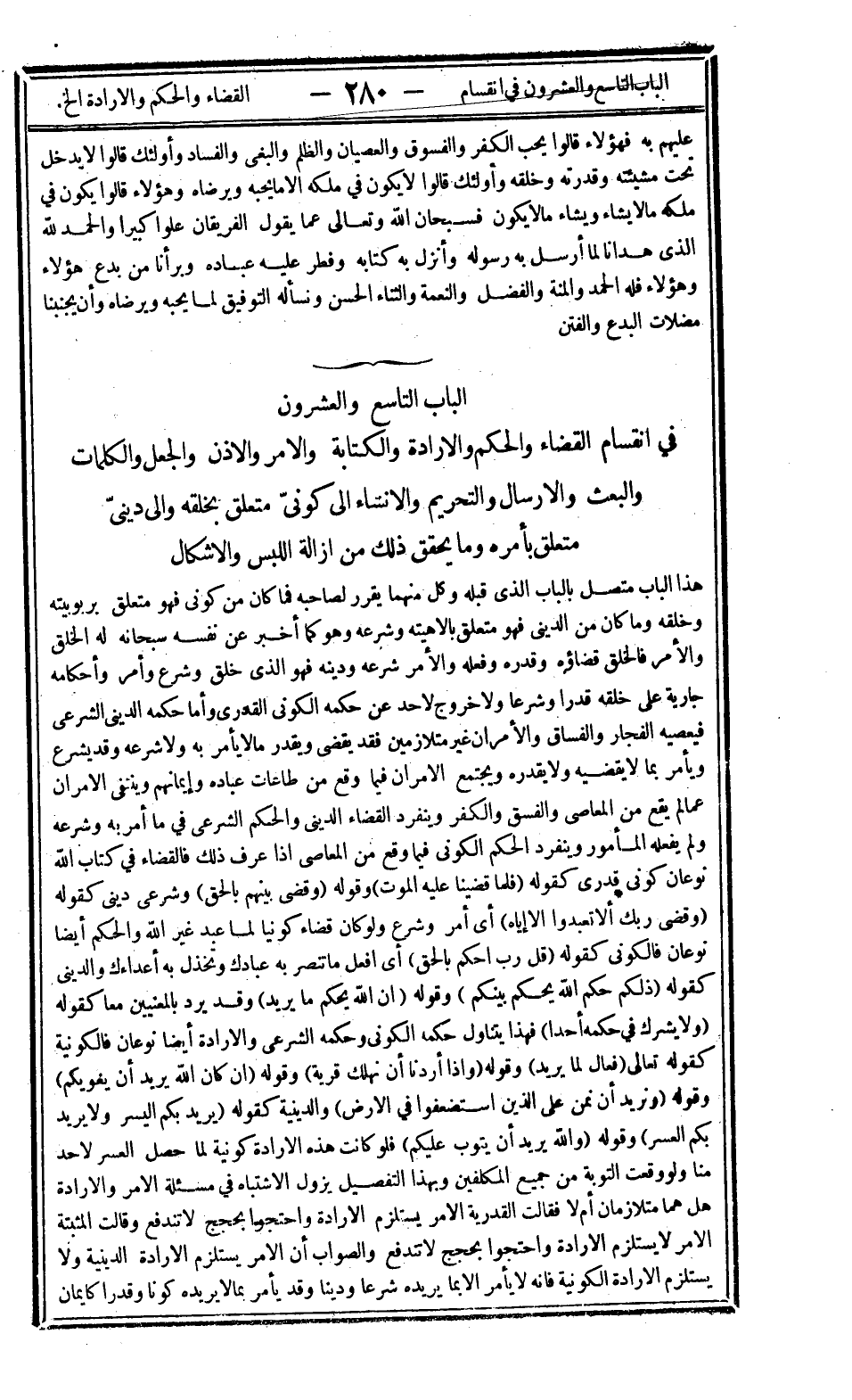 الباب التاسع والعشرون: في انقسام القضاء والحكم والإرادة والكتابة والأمر والإذن والجعل والكلمات والبعث والإرسال والتحريم والانتباه إلى كوني متعلق بخلقه وإلى ديني متعلق بأمره وما يحقق ذلك من إزالة اللبس والإشكال.