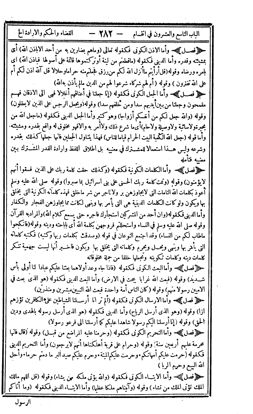 فصل: وأما التحريم الكوني فكقوله: {وَحَرَّمْنَا عَلَيْهِ الْمَرَاضِعَ مِنْ قَبْلُ} وقوله: {قَالَ فَإِنَّهَا مُحَرَّمَةٌ عَلَيْهِمْ أَرْبَعِينَ سَنَةً} وقوله: {وَحَرَامٌ عَلَى قَرْيَةٍ أَهْلَكْنَاهَا أَنَّهُمْ لا يَرْجِعُونَ} وأما التحريم الديني فكقوله: {حُرِّمَتْ عَلَيْكُمْ أُمَّهَاتُكُمْ} و {حُرِّمَتْ عَلَيْكُمُ الْمَيْتَةُ} : {وَحُرِّمَ عَلَيْكُمْ صَيْدُ الْبَرِّ مَا دُمْتُمْ حُرُماً} : {وَأَحَلَّ اللَّهُ الْبَيْعَ وَحَرَّمَ الرِّبا} .