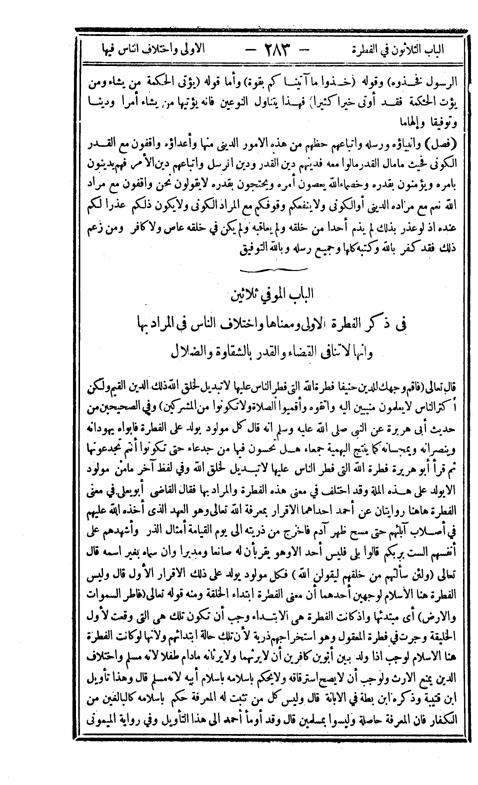 الباب الموفي ثلاثين: في ذكر الفطرة الأولى ومعناها واختلاف الناس في المراد بها وأنها لا تنافي القضاء والقدر بالشقاوة والضلال.
