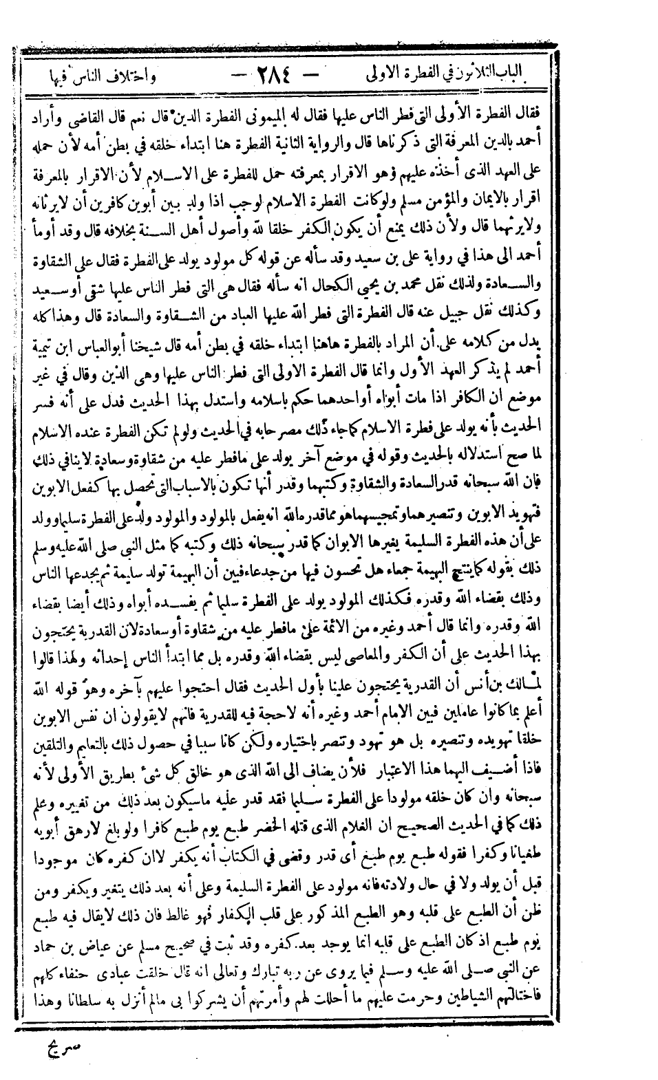 فقال الفطرة الأولى التي فطر الناس عليها فقال له الميموني الفطرة الدين قال نعم قال القاضي وأراد أحمد بالدين المعرفة التي ذكرناها" قال والرواية الثانية: "الفطرة هنا ابتداء خلقه في بطن أمه لأن حمله على العهد الذي أخذه عليهم وهو الإقرار بمعرفته حمل للفطرة على الإسلام لأن الإقرار بالمعرفة إقرار بالإيمان والمؤمن مسلم ولو كانت الفطرة الإسلام لوجب إذا ولد بين أبوين كافرين أن لا يرثانه ولا يرثهما قال ولأن ذلك يمنع أن يكون الكفر خلقا لله وأصول أهل السنة بخلافه قال وقد أومأ أحمد إلى هذا في رواية على بن سعيد وقد سأله عن قوله كل مولود يولد على الفطرة فقال على الشقاوة والسعادة ولذلك نقل محمد بن يحيى الكحال أنه سأله فقال هي التي فطر الناس عليها شقي أو سعيد وكذلك نقل جبيل عنه قال الفطرة التي فطر الله عليها العباد من الشقاوة والسعادة قال وهذا كله يدل من كلامه على أن المراد بالفطرة ها هنا ابتداء خلقه في بطن أمه" قال شيخنا أبو العباس ابن تيمية أحمد: "لم يذكر العهد الأول وإنما قال الفطرة الأولى التي فطر الناس عليها وهي الدين وقال في غير موضع أن الكافر إذا مات أبواه أو أحدهما حكم بإسلامه واستدل بهذا الحديث فدل على أنه فسر الحديث بأنه يولد على فطرة الإسلام كما جاء ذلك مصرحا به في الحديث ولو لم تكن الفطرة عنده الإسلام لما صح استدلاله بالحديث" وقوله في موضع آخر: "يولد على ما فطر عليه من شقاوة وسعادة لا ينافي ذلك فإن الله سبحانه قدر السعادة والشقاوة وكتبهما وقدر أنها تكون بالأسباب التي تحصل بها كفعل الأبوين فتهويد الأبوين وتنصيرهما وتمجيسهما هو مما قدره الله أنه يفعل بالمولود والمولود ولد على الفطرة سليما وولد على أن هذه الفطرة السليمة يغيرها الأبوان كما قدر سبحانه ذلك وكتبه كما مثل النبي صلى الله عليه وسلم ذلك بقوله كما ينتج البهيمة جمعاء هل تحسون فيها من جدعاء فبين أن البهيمة تولد سليمة ثم يجدعها الإنسان وذلك بقضاء الله وقدره فكذلك المولود يولد على الفطرة سليما ثم يفسده أبواه وذلك أيضا بقضاء الله وقدره وإنما قال أحمد وغيره من الأئمة على ما فطر عليه من شقاوة أو سعادة لأن القدرية يحتجون بهذا الحديث على أن الكفر والمعاصي ليس بقضاء الله وقدره بل مما ابتدأ الناس إحداثه ولهذا قالوا لمالك بن أنس أن القدرية يحتجون علينا بأول الحديث فقال احتجوا عليهم بآخره وهو قول الله أعلم بما كانوا عاملين فبين الإمام أحمد وغيره أنه لا حجة فيه للقدرية فإنهم لا يقولون أن نفس الأبوين خلقا تهويده وتنصيره بل هو تهود وتنصر باختياره ولكن كانا سببا في حصول ذلك بالتعليم والتلقين فإذا أضيف إليهما هذا الاعتبار فلأن يضاف إلى الله الذي هو خالق كل شيء بطريق الأولى لأنه سبحانه وإن كان خلقه مولودا على الفطرة سليما فقد قدر عليه ما سيكون بعد ذلك من تغييره وعلم ذلك كما في الحديث الصحيح "أن الغلام الذي قتله الخضر طبع يوم طبع كافرا ولو بلغ لأرهق أبويه طغيانا وكفرا" فقوله طبع يوم طبع أي قدر وقضى في الكتاب أنه يكفر لا أن كفره كان موجودا قبل أن يولد ولا في حال ولادته فإنه مولود على الفطرة السليمة وعلى أنه بعد ذلك يتغير ويكفر من ظن أن الطبع على قلبه وهو الطبع المذكور على قلب الكفار فهو غالط فإن ذلك لا يقال فيه طبع يوم طبع إذ كان الطبع على قلبه إنما يوجد بعد كفره وقد ثبت في صحيح مسلم عن عياض بن حماد عن النبي صلى الله عليه وسلم فيما يروي عن ربه تبارك وتعالى أنه قال: "خلقت عبادي حنفاء كلهم فاجتالتهم الشياطين وحرمت عليهم ما أحللت لهم وأمرتهم أن يشركوا بي ما لم أنزل به سلطانا" وهذا