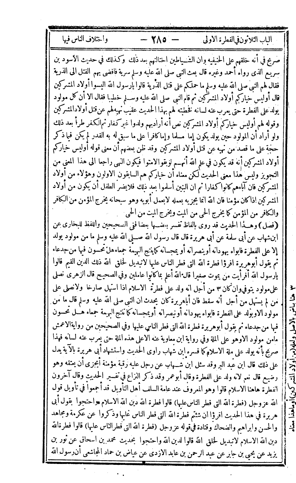 فصل: وهذا الحديث قد روي بألفاظ تفسر بعضها بعضا ففي الصحيحين واللفظ للبخاري عن ابن شهاب عن أبي سلمة عن أبي هريرة قال قال رسول الله صلى الله عليه وسلم: "ما من مولود يولد إلا على الفطرة فأبواه يهودانه أو ينصرانه أو يمجسانه كما ينتج البهيمة جمعاء هل تحسون فيها من جدعاء ثم يقول أبو هريرة اقرؤوا: {فِطْرَتَ اللَّهِ الَّتِي فَطَرَ النَّاسَ عَلَيْهَا لا تَبْدِيلَ لِخَلْقِ اللَّهِ ذَلِكَ الدِّينُ الْقَيِّمُ} قالوا يا رسول الله أفرأيت من يموت صغيرا قال الله أعلم بما كانوا عاملين" وفي الصحيح قال الزهري: "نصلي على مولود يتوفى وإن كان من أجل أنه ولد على فطرة الإسلام إذا استهل صارخا ولا نصلي على من لم يستهل من أجل أنه سقط" فإن أبا هريرة كان يحدث أن النبي صلى الله عليه وسلم قال: "ما من مولود إلا ويولد على الفطرة فأبواه يهودانه أو ينصرانه أو يمجسانه كما تنتج البهيمة جمعاء هل تحسون فيها من جدعاء ثم يقول أبو هريرة: {فِطْرَتَ اللَّهِ الَّتِي فَطَرَ النَّاسَ عَلَيْهَا} " وفي الصحيحين من رواية الأعمش: "ما من مولود إلا وهو على الملة" وفي رواية ابن معاوية عنه: "إلا على هذه الملة" حتى يعرب عنه لسانه فهذا صريح بأنه يولد على ملة الإسلام كما فسره ابن شهاب راوي الحديث واستشهاد أبي هريرة بالآية يدل على ذلك قال ابن عبد البر وقد سئل ابن شهاب عن رجل عليه رقبة مؤمنة أيجزي أن يعتقه وهو رضيع قال نعم لأنه ولد على الفطرة وقال أبو عمر وقد ذكر النزاع في تفسير الحديث وقال آخرون الفطرة ها هنا الإسلام قالوا وهو المعروف عند عامة السلف أهل التأويل قد أجمعوا في تأويل قول الله عز وجل: {فِطْرَتَ اللَّهِ الَّتِي فَطَرَ النَّاسَ عَلَيْهَا} قالوا فطرة الله دين الله الإسلام واحتجوا بقول أبي هريرة في هذا الحديث اقرؤا إن شئتم فطرة الله التي فطر الناس عليها وذكروا عن عكرمة ومجاهد والحسن وإبراهيم والضحاك وقتادة في قوله عز وجل: {فِطْرَتَ اللَّهِ الَّتِي فَطَرَ النَّاسَ عَلَيْهَا} قالوا: "فطرة الله دين الله الإسلام لا تبديل لخلق الله قالوا لدين الله" واحتجوا بحديث محمد بن إسحاق عن ثور بن يزيد عن يحيى بن جابر عن عبد الرحمن بن عابد الأزدي عن عياض بن حماد المجاشعي أن رسول الله