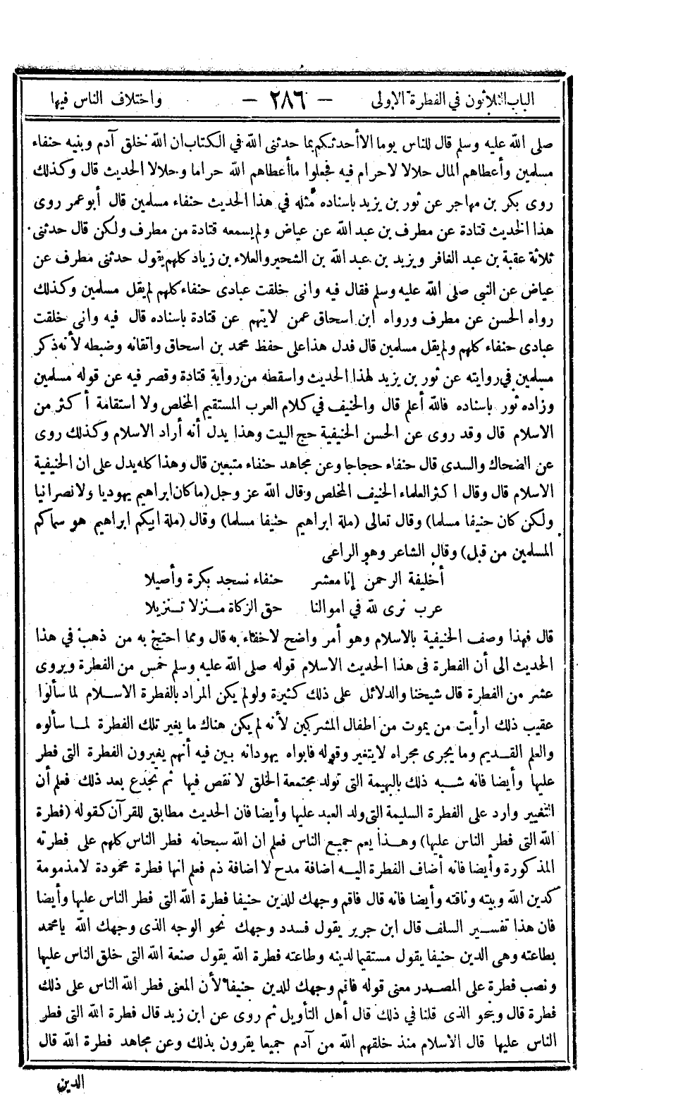 قال فهذا وصف الحنيفية بالإسلام وهو أمر واضح لا خفاء به قال ومما احتج به من ذهب في هذا الحديث إلى أن الفطرة في هذا الحديث الإسلام قوله صلى الله عليه وسلم: "خمس من الفطرة" ويروى "عشر من الفطرة" قال شيخنا: "والدلائل على ذلك كثيرة ولو لم يكن المراد بالفطرة الإسلام لما سألوا عقيب ذلك أرأيت من يموت من أطفال المشركين لأنه لم يكن هناك ما يغير تلك الفطرة لما سألوه والعلم القديم وما يجرى مجراه لا يتغير" وقوله فأبواه يهودانه بين فيه أنهم يغيرون الفطرة التي فطر عليها وأيضا فإنه شبه ذلك بالبهيمة التي تولد مجتمعة الخلق لا نقص فيها ثم تجدع بعد ذلك فعلم أن التغير وأرد على الفطرة السليمة التي ولد العبد عليها وأيضا فان الحديث مطابق للقرآن كقوله: {فِطْرَتَ اللَّهِ الَّتِي فَطَرَ النَّاسَ عَلَيْهَا} وهذا يعم جميع الناس فعلم أن الله سبحانه فطر الناس كلهم على فطرته المذكورة وأيضا فإنه أضاف الفطرة إليه إضافة مدح لا إضافة ذم فعلم أنها فطرة محمودة لا مذمومة كدين الله وبيته وناقته وأيضا فإنه قال فأقم وجهك للدين حنيفا فطرة الله التي فطر الناس عليها وأيضا فإن هذا تفسير السلف قال ابن جرير: "يقول فسدد وجهك نحو الوجه الذي وجهك الله يا محمد بطاعته وهي الدين حنيفا" يقول مستقيما لدينه وطاعته فطرة الله يقول صنعة الله خلق الناس عليها ونصب فطرة على المصدر معنى قوله فأقم وجهك للدين حنيفا لأن المعنى فطر الله الناس على ذلك فطرة قال وبنحو الذي قلنا في ذلك قال أهل التأويل ثم روى عن ابن زيد قال: "فطرة الله التي فطر الناس عليها قال الإسلام منذ خلقهم الله من آدم جميعا يقرون بذلك" وعن مجاهد: "فطرة الله قال