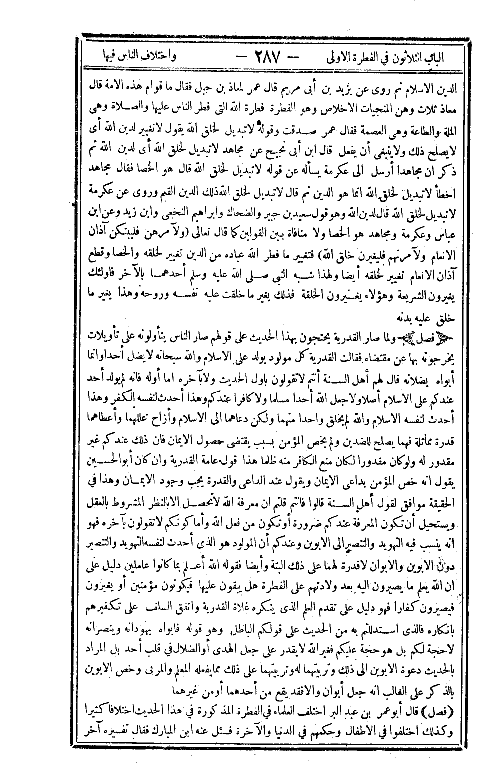 فصل: قال أبو عمر بن عبد البر اختلف العلماء في الفطرة المذكورة في هذا الحديث اختلافا كثيرا وكذلك اختلفوا في الأطفال وحكمهم في الدنيا والآخرة فسئل عنه ابن المبارك فقال: "تفسيره آخر