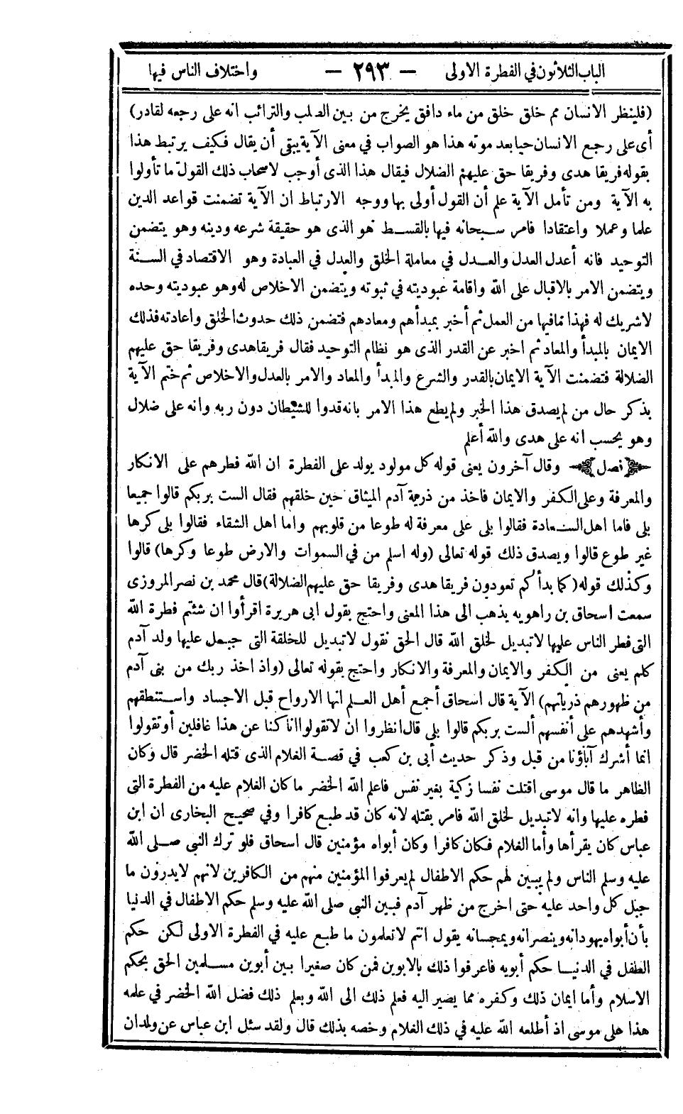 فصل: وقال آخرون يعني قوله كل مولود يولد على الفطرة أن الله فطرهم على الإنكار والمعرفة وعلى الكفر والإيمان فأخذ من ذرية آدم الميثاق حين خلقهم فقال ألست بربكم قالوا جميعا بلى فأما أهل السعادة فقالوا بلى على معرفة له طوعا من قلوبهم وأما أهل الشقاء فقالوا بلى كرها غير طوع قالوا ويصدق ذلك قوله تعالى: {وَلَهُ أَسْلَمَ مَنْ فِي السَّمَاوَاتِ وَالْأَرْضِ طَوْعاً وَكَرْهاً} قالوا وكذلك قوله: {كَمَا بَدَأَكُمْ تَعُودُونَ فَرِيقاً هَدَى وَفَرِيقاً حَقَّ عَلَيْهِمُ الضَّلالَةُ} قال محمد بن نصر المروزي سمعت إسحاق بن راهويه يذهب إلى هذا المعنى واحتج بقول أبي هريرة: "اقرؤوا إن شئتم: {فِطْرَتَ اللَّهِ الَّتِي فَطَرَ النَّاسَ عَلَيْهَا لا تَبْدِيلَ لِخَلْقِ اللَّهِ} " قال الحق نقول لا تبديل للخلقة التي جبل عليها ولد آدم كلهم يعني من الكفر والإيمان والمعرفة والإنكار واحتج بقوله تعالى: {وَإِذْ أَخَذَ رَبُّكَ مِنْ بَنِي آدَمَ مِنْ ظُهُورِهِمْ ذُرِّيَّتَهُمْ} الآية قال إسحاق أجمع أهل العلم أنها الأرواح قبل الأجساد واستنطقهم وأشهدهم على أنفسهم ألست بربكم قالوا بلى قال انظروا أن لا تقولوا أنا كنا عن هذا غافلين أو تقولوا إنما أشرك آباؤنا من قبل وذكر حديث أبي بن كعب في قصة الغلام الذي قتله الخضر قال وكان الظاهر ما قال موسى أقتلت نفسا زكية بغير نفس فأعلم الله الخضر ما كان الغلام عليه من الفطرة التي فطره عليها وأنه لا تبديل لخلق الله فأمر بقتله لأنه كان قد طبع كافرا وفي صحيح البخاري أن ابن عباس كان يقرأها وأما الغلام فكان كافرا وكان أبواه مؤمنين قال إسحاق: "فلو ترك النبي صلى الله عليه وسلم الناس ولم يبين لهم حكم الأطفال لم يعرفوا المؤمنين منهم من الكافرين" لأنهم لا يدرون ما جبل كل واحد عليه حتى أخرج من ظهر آدم فبين النبي صلى الله عليه وسلم حكم الأطفال في الدنيا بأن أبواه يهودانه وينصرانه ويمجسانه يقول أنتم لا تعلمون ما طبع عليه في الفطرة الأولى لكن حكم الطفل في الدنيا حكم أبويه فاعرفوا ذلك بالأبوين فمن كان صغيرا بين أبوين مسلمين ألحق بحكم الإسلام وأما إيمان ذلك وكفره مما يصير إليه فعلم ذلك إلى الله وبعلم ذلك فضل الله الخضر في علمه هذا على موسى إذ أطلعه الله عليه في ذلك الغلام وخصه بذلك قال ولقد سئل ابن عباس عن ولدان