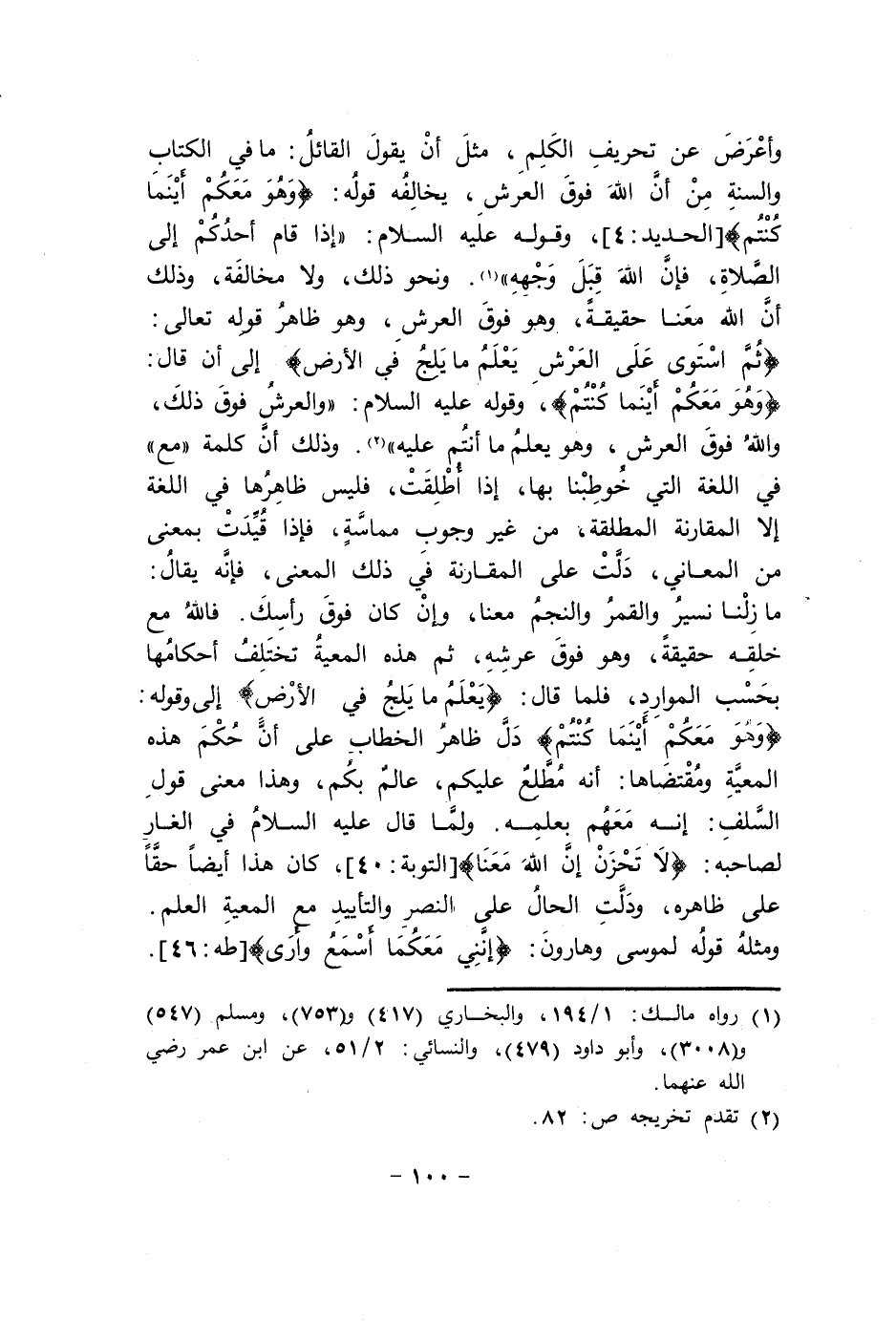 وَأعْرض عَن تَحْرِيف الْكَلم مثل أَن يَقُول الْقَائِل مَا فِي الْكتاب وَالسّنة من أَن الله فَوق الْعَرْش يُخَالِفهُ قَوْله {وَهُوَ مَعكُمْ أَيْن مَا كُنْتُم} الْحَدِيد 4 وَقَوله عَلَيْهِ السَّلَام إِذا قَامَ أحدكُم إِلَى الصَّلَاة فَإِن الله قبل وَجهه وَنَحْو ذَلِك وَلَا مُخَالفَة وَذَلِكَ أَن الله مَعنا حَقِيقَة وَهُوَ فَوق الْعَرْش وَهُوَ ظَاهر قَوْله تَعَالَى {ثمَّ اسْتَوَى على الْعَرْش يعلم مَا يلج فِي الأَرْض} إِلَى أَن قَالَ {وَهُوَ مَعكُمْ أَيْن مَا كُنْتُم} وَقَوله عَلَيْهِ السَّلَام وَالْعرش فَوق ذَلِك وَالله فَوق الْعَرْش وَهُوَ يعلم مَا أَنْتُم عَلَيْهِ وَذَلِكَ أَن كلمة مَعَ فِي اللُّغَة الَّتِي خوطبنا بهَا إِذا أطلقت فَلَيْسَ ظَاهرهَا فِي اللُّغَة إِلَّا الْمُقَارنَة الْمُطلقَة من غير وجوب مماسة فَإِذا قيدت بِمَعْنى من الْمعَانِي دلّت على الْمُقَارنَة فِي ذَلِك الْمَعْنى فَإِنَّهُ يُقَال مَا زلنا نسير وَالْقَمَر والنجم مَعنا وَإِن كَانَ فَوق رَأسك فَالله مَعَ خلقه حَقِيقَة وَهُوَ فَوق عَرْشه ثمَّ هَذِه الْمَعِيَّة تخْتَلف أَحْكَامهَا بِحَسب الْمَوَارِد فَلَمَّا قَالَ {يعلم مَا يلج فِي الأَرْض} إِلَى قَوْله {وَهُوَ مَعكُمْ أَيْن مَا كُنْتُم} دلّ ظَاهر الْخطاب على أَن حكم هَذِه الْمَعِيَّة ومقتضاها أَنه مطلع عَلَيْكُم عَالم بكم وَهَذَا معنى قَول السّلف إِنَّه مَعكُمْ بِعِلْمِهِ وَلما قَالَ عَلَيْهِ السَّلَام فِي الْغَار لصَاحبه {لَا تحزن إِن الله مَعنا} التَّوْبَة 40 كَانَ هَذَا أَيْضا حَقًا على ظَاهره ودلت الْحَال على النَّصْر والتأييد مَعَ الْمَعِيَّة الْعلم وَمثله قَوْله لمُوسَى وَهَارُون {إِنَّنِي مَعَكُمَا أسمع وَأرى} طه 46