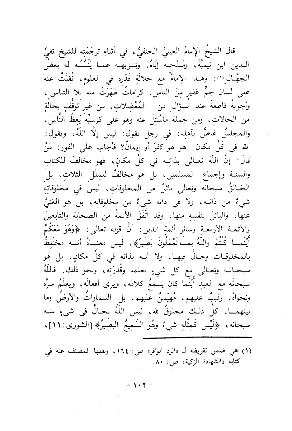 قَالَ الشَّيْخ الإِمَام الْعَيْنِيّ الْحَنَفِيّ فِي أثْنَاء تَرْجَمته للشَّيْخ تَقِيّ الدّين ابْن تَيْمِية ومدحه إِيَّاه وتنزيهه عَمَّا ينْسبهُ لَهُ بعض الْجُهَّال وَهَذَا الإِمَام مَعَ جلالة قدره فِي الْعُلُوم نقلت عَنهُ على لِسَان جم غفير من النَّاس كرامات ظَهرت مِنْهُ بِلَا التباس وأجوبة قَاطِعَة عِنْد السُّؤَال من المعضلات من غير توقف بِحَالَة من الْحَالَات وَمن جملَة مَا سُئِلَ عَنهُ وَهُوَ على كرسيه يعظ النَّاس والمجلس غاص بأَهْله فِي رجل يَقُول لَيْسَ إِلَّا الله وَيَقُول الله فِي كل مَكَان هُوَ هُوَ كفر أَو إِيمَان فَأجَاب على الْفَوْر من قَالَ إِن الله تَعَالَى بِذَاتِهِ فِي كل مَكَان فَهُوَ مُخَالف للْكتاب وَالسّنة وَإِجْمَاع الْمُسلمين بل هُوَ مُخَالف للملل الثَّلَاث بل الْخَالِق سُبْحَانَهُ وَتَعَالَى بَائِن من الْمَخْلُوقَات لَيْسَ فِي مخلوقاته شَيْء من ذَاته وَلَا فِي ذَاته شَيْء من مخلوقاته بل هُوَ الْغَنِيّ عَنْهَا والبائن بِنَفسِهِ مِنْهَا وَقد اتّفق الْأَئِمَّة من الصَّحَابَة وَالتَّابِعِينَ وَالْأَئِمَّة الْأَرْبَعَة وَسَائِر أَئِمَّة الدّين أَن قَوْله تَعَالَى {وَهُوَ مَعكُمْ أَيْن مَا كُنْتُم وَالله بِمَا تَعْمَلُونَ بَصِير} لَيْسَ مَعْنَاهُ أَنه مختلط بالمخلوقات وَحَال فِيهَا وَلَا أَنه بِذَاتِهِ فِي كل مَكَان بل هُوَ سُبْحَانَهُ وَتَعَالَى مَعَ كل شَيْء بِعِلْمِهِ وَقدرته وَنَحْو ذَلِك فَالله سُبْحَانَهُ مَعَ العَبْد أَيْنَمَا كَانَ يسمع كَلَامه وَيرى أَفعاله وَيعلم سره ونجواه رَقِيب عَلَيْهِم مهيمن عَلَيْهِم بل السَّمَاوَات وَالْأَرْض وَمَا بَينهمَا كل ذَلِك مَخْلُوق لله لَيْسَ الله بِحَال فِي شَيْء مِنْهُ سُبْحَانَهُ {لَيْسَ كمثله شَيْء وَهُوَ السَّمِيع الْبَصِير} الشورى 11