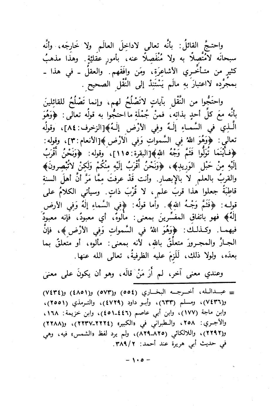 وَاحْتَجُّوا من النَّقْل بآيَات لَا تصلح لَهُم وَإِنَّمَا تصلح لِلْقَائِلين بِأَنَّهُ مَعَ كل أحد بِذَاتِهِ فَمن جملَة مَا احْتَجُّوا بِهِ قَوْله تَعَالَى {وَهُوَ الَّذِي فِي السَّمَاء إِلَه وَفِي الأَرْض إِلَه} الزخرف 84 وَقَوله تَعَالَى {وَهُوَ الله فِي السَّمَاوَات وَفِي الأَرْض} الْأَنْعَام 3 وَقَوله {فأينما توَلّوا فثم وَجه الله} الْبَقَرَة 115 وَقَوله {وَنحن أقرب إِلَيْهِ من حَبل الوريد} {وَنحن أقرب إِلَيْهِ مِنْكُم وَلَكِن لَا تبصرون} والقرب بِالْعلمِ لَا بالإبصار وَأَنت قد عرفت مِمَّا مر أَن أهل السّنة قاطبة جعلُوا هَذَا قرب علم لَا قرب ذَات وَسَيَأْتِي الْكَلَام على قَوْله {فثم وَجه الله} وَأما قَوْله {فِي السَّمَاء إِلَه وَفِي الأَرْض إِلَه} فَهُوَ بِاتِّفَاق الْمُفَسّرين بِمَعْنى مألوه أَي معبود فَإِنَّهُ معبود فيهمَا وَكَذَلِكَ {وَهُوَ الله فِي السَّمَاوَات وَفِي الأَرْض} فَإِن الْجَار وَالْمَجْرُور مُتَعَلق بِاللَّه لِأَنَّهُ بِمَعْنى مألوه أَو مُتَعَلق بِمَا بعده وَلَوْلَا ذَلِك للَزِمَ عَلَيْهِ الظَّرْفِيَّة تَعَالَى الله عَنْهَا
