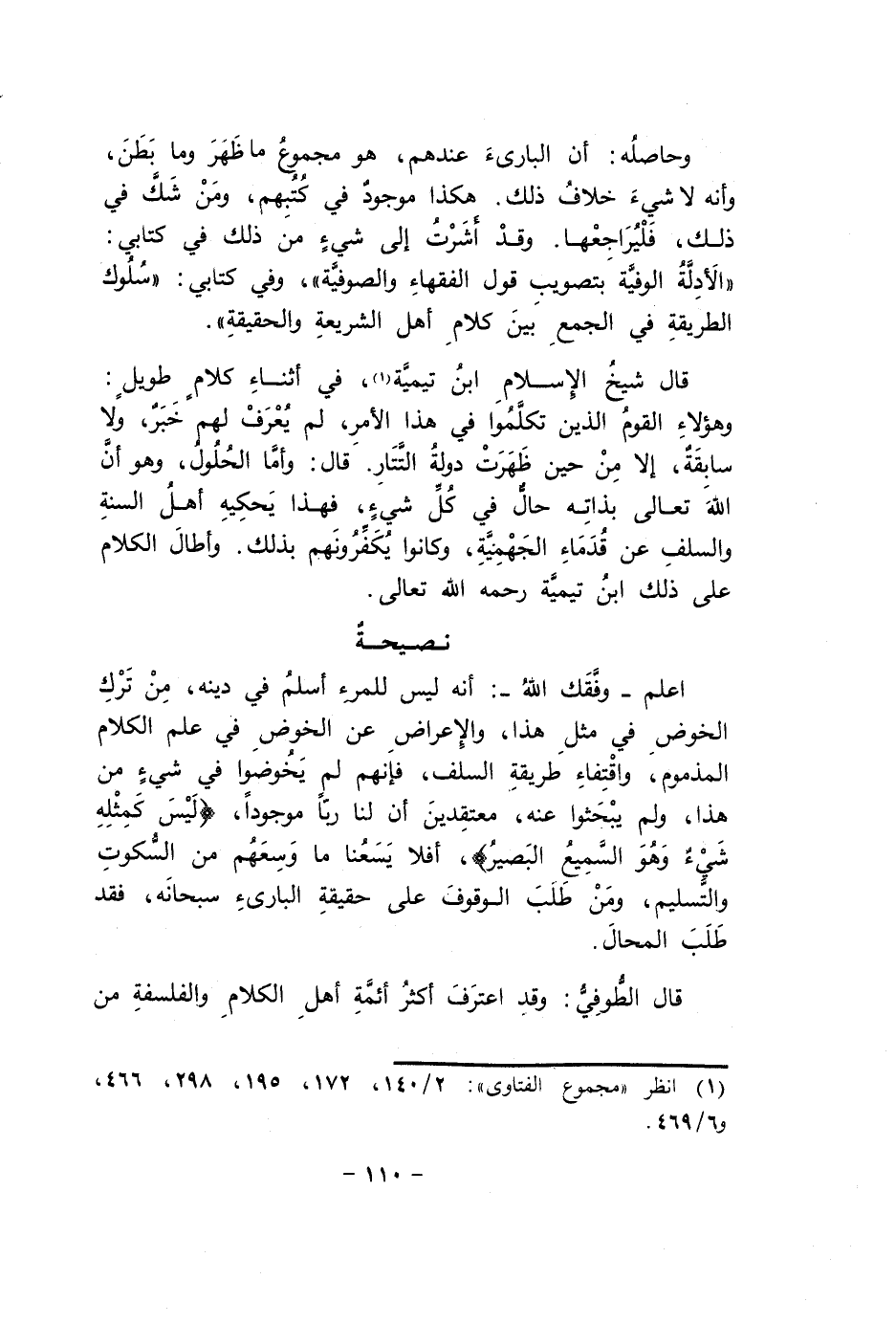 اعْلَم وفقك الله أَنه لَيْسَ للمرء أسلم فِي دينه من ترك الْخَوْض فِي مثل هَذَا والإعراض عَن الْخَوْض فِي علم الْكَلَام المذموم واقتفاء طَريقَة السّلف فَإِنَّهُم لم يخوضوا فِي شَيْء من هَذَا وَلم يبحثوا عَنهُ معتقدين أَن لنا رَبًّا مَوْجُودا {لَيْسَ كمثله شَيْء وَهُوَ السَّمِيع الْبَصِير} أَفلا يسعنا مَا وسعهم من السُّكُوت وَالتَّسْلِيم وَمن طلب الْوُقُوف على حَقِيقَة البارئ سُبْحَانَهُ فقد طلب الْمحَال