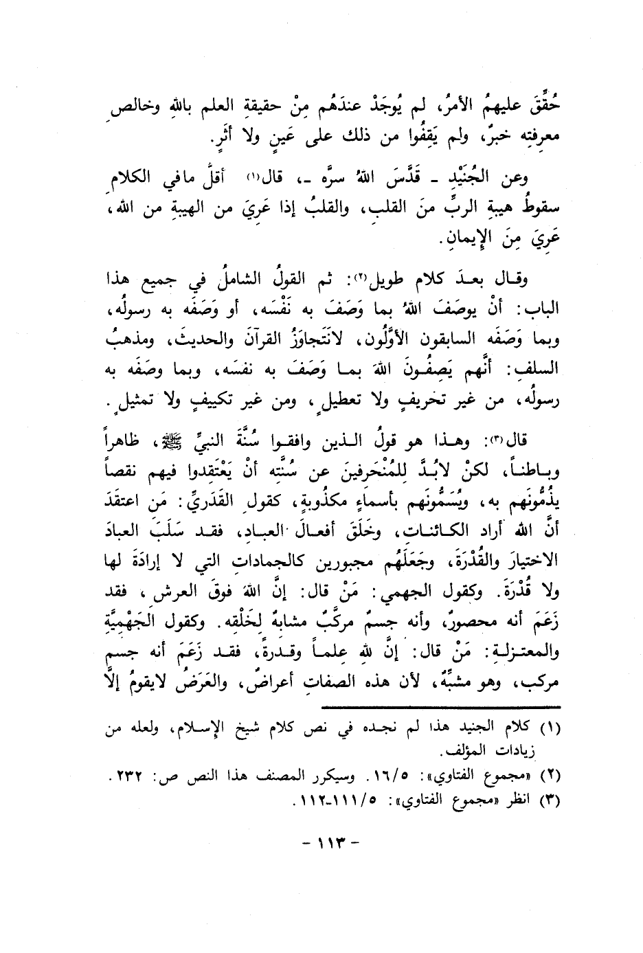 وَقَالَ بعد كَلَام طَوِيل ثمَّ القَوْل الشَّامِل فِي جَمِيع هَذَا الْبَاب أَن يُوصف الله بِمَا وصف بِهِ نَفسه أَو وَصفه بِهِ رَسُوله وَبِمَا وَصفه السَّابِقُونَ الْأَولونَ لَا نتجاوز الْقُرْآن والْحَدِيث وَمذهب السّلف أَنهم يصفونَ الله بِمَا وصف بِهِ نَفسه وَبِمَا وَصفه بِهِ رَسُوله من غير تَحْرِيف وَلَا تَعْطِيل وَمن غير تكييف وَلَا تَمْثِيل