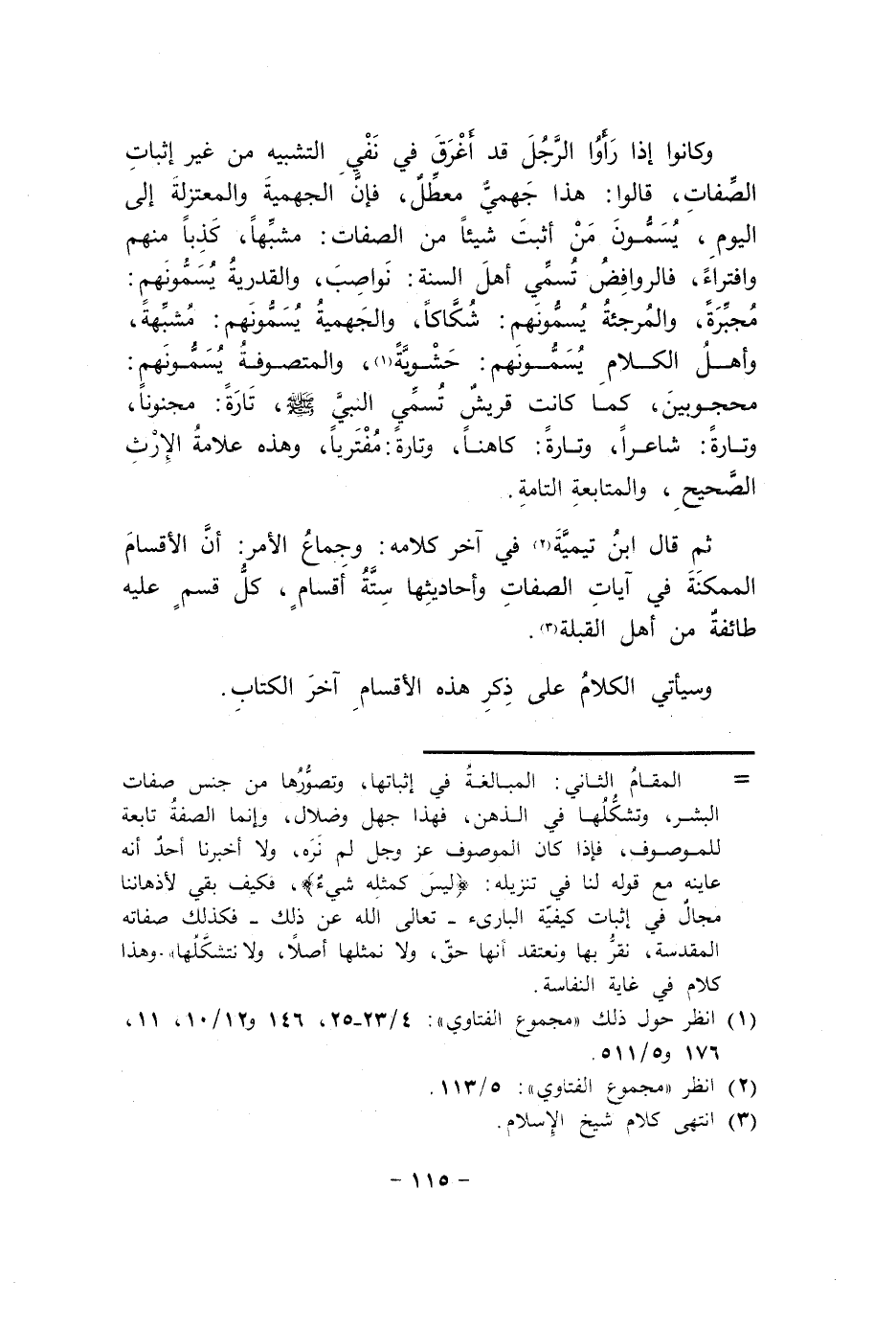 ثمَّ قَالَ ابْن تَيْمِية فِي آخر كَلَامه وجماع الْأَمر أَن الْأَقْسَام الممكنة فِي آيَات الصِّفَات وأحاديثها سِتَّة أَقسَام كل قسم عَلَيْهِ طَائِفَة من أهل الْقبْلَة