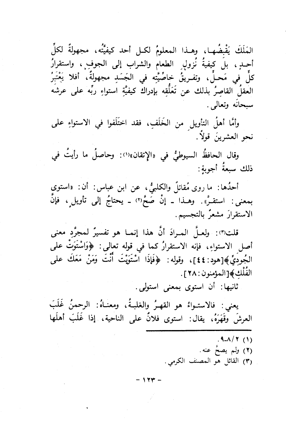 قلت وَلَعَلَّ المُرَاد أَن هَذَا إِنَّمَا هُوَ تَفْسِير لمُجَرّد معنى أصل الإستواء فَإِنَّهُ الإستقرار كَمَا فِي قَوْله تَعَالَى {واستوت على الجودي} هود 44 وَقَوله {فَإِذا استويت أَنْت وَمن مَعَك على الْفلك} الْمُؤْمِنُونَ 28