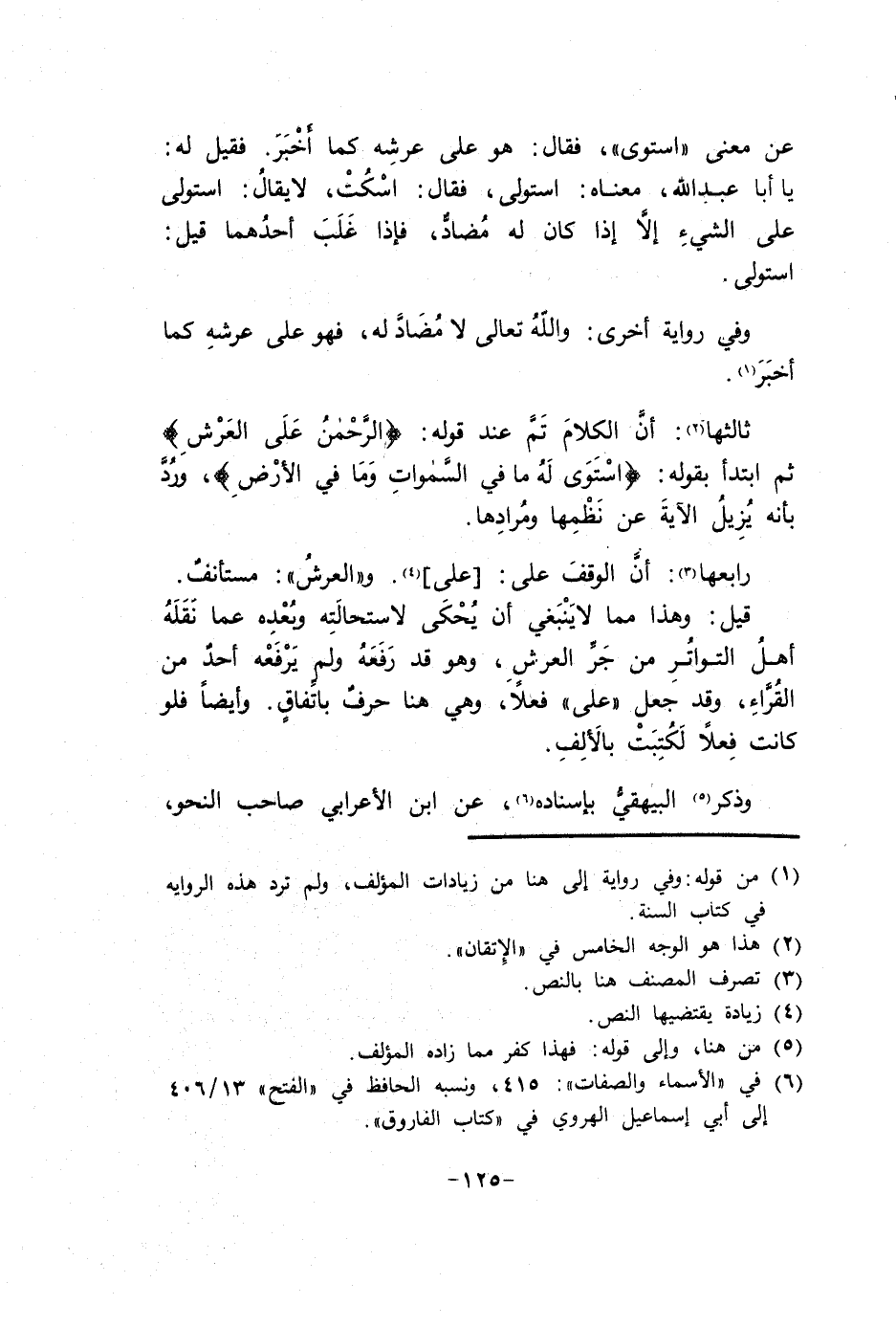 ثَالِثهَا أَن الْكَلَام تمّ عِنْد قَوْله {الرَّحْمَن على الْعَرْش} ثمَّ ابْتَدَأَ بقوله {اسْتَوَى لَهُ مَا فِي السَّمَاوَات وَمَا فِي الأَرْض} ورد بِأَنَّهُ يزِيل الأية عَن نظمها ومرادها
