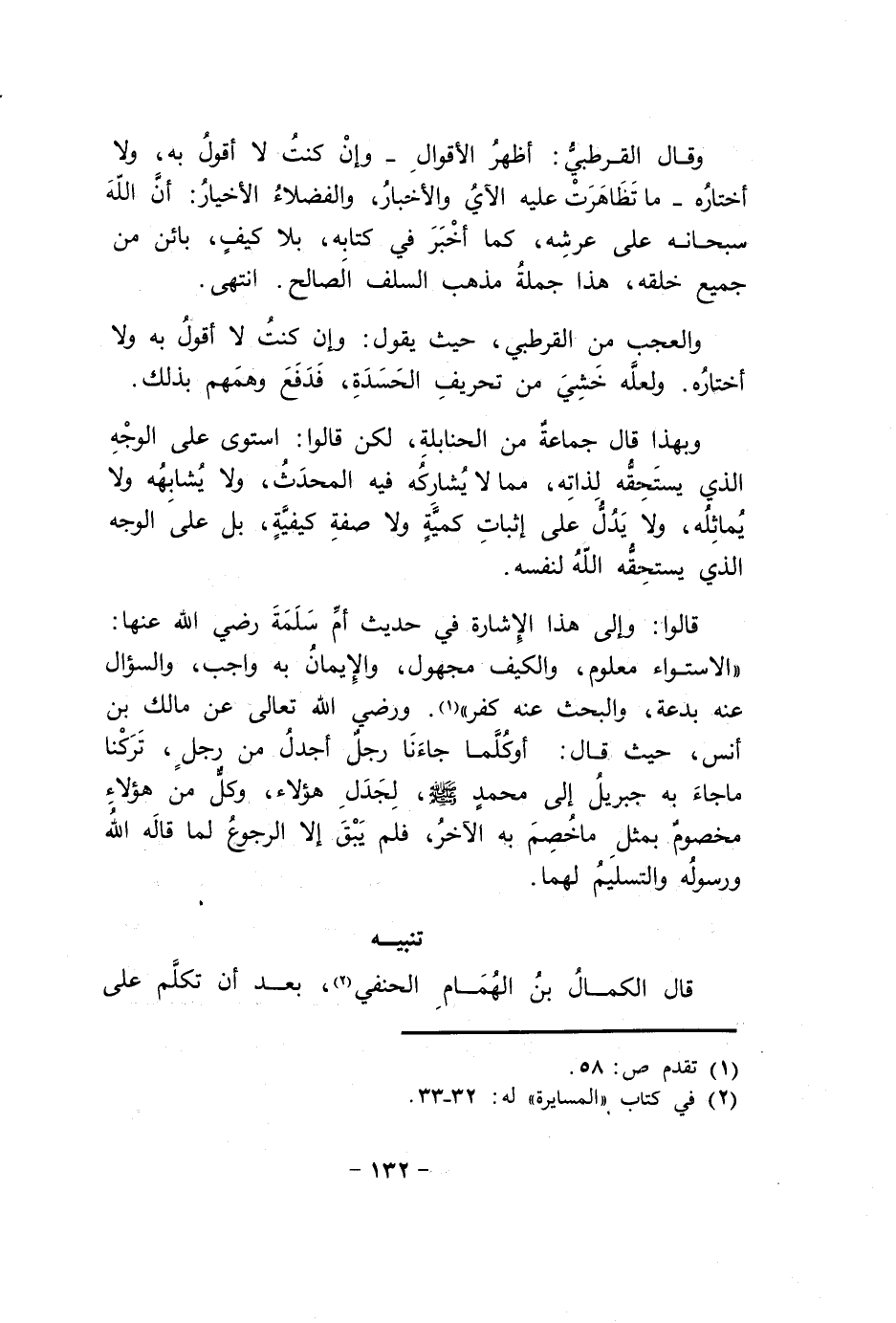 وَقَالَ الْقُرْطُبِيّ أظهر الْأَقْوَال وَإِن كنت لَا أَقُول بِهِ وَلَا أختاره مَا تظاهرت عَلَيْهِ الْآي وَالْأَخْبَار والفضلاء الأخيار أَن الله سُبْحَانَهُ على عَرْشه كَمَا أخبر فِي كِتَابه بِلَا كَيفَ بَائِن من جَمِيع خلقه هَذَا جملَة مَذْهَب السّلف الصَّالح انْتهى