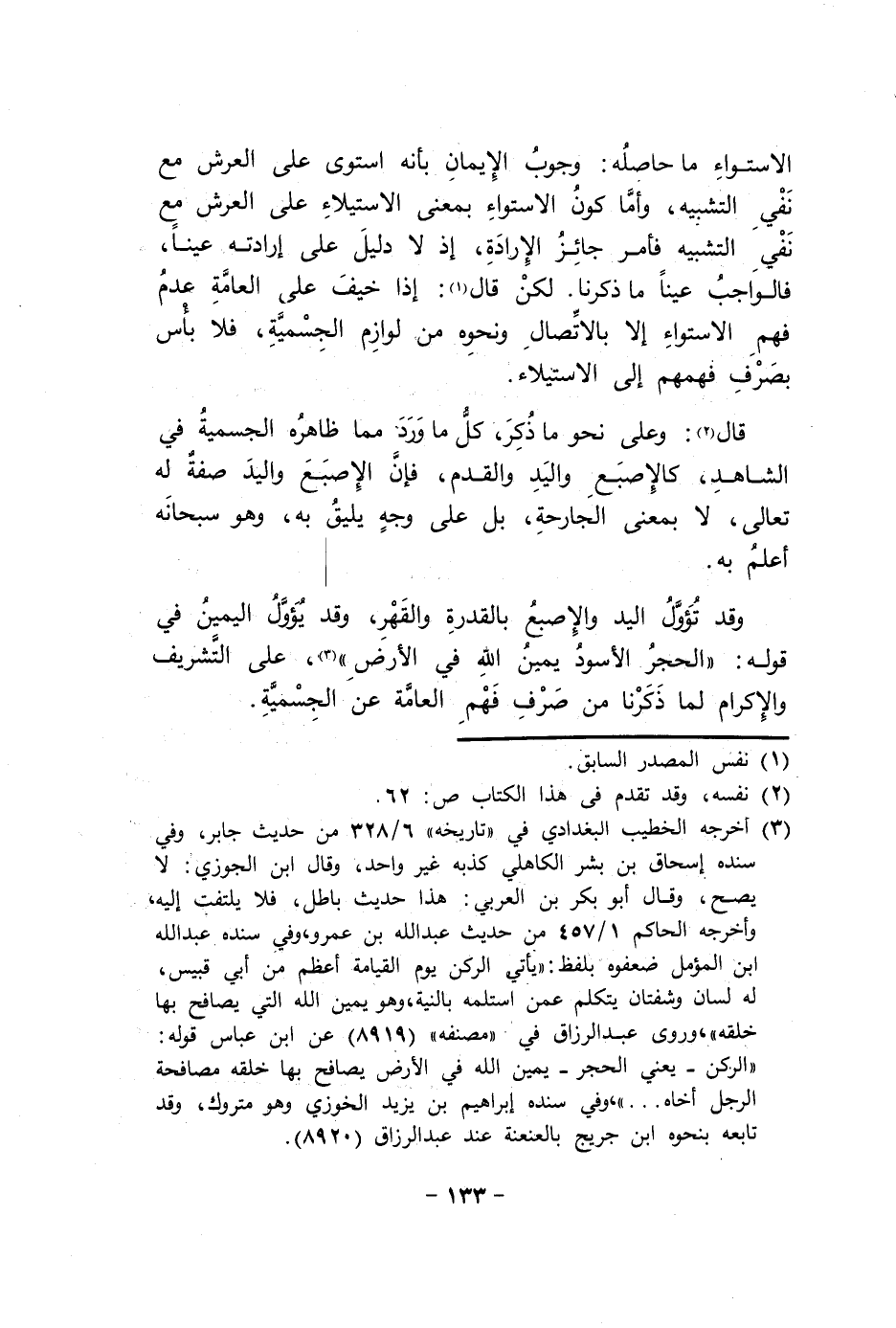 الإستواء مَا حَاصله وجوب الْإِيمَان بِأَنَّهُ اسْتَوَى على الْعَرْش مَعَ نفي التَّشْبِيه وَأما كَون الإستواء بِمَعْنى الإستيلاء على الْعَرْش مَعَ نفي التَّشْبِيه فَأمر جَائِز الْإِرَادَة إِذْ لَا دَلِيل على إِرَادَته عينا فَالْوَاجِب عينا مَا ذكرنَا لَكِن قَالَ إِذا خيف على الْعَامَّة عدم فهم الإستواء إِلَّا بالإتصال وَنَحْوه من لَوَازِم الجسمية فَلَا بَأْس بِصَرْف فهمهم إِلَى الإستيلاء