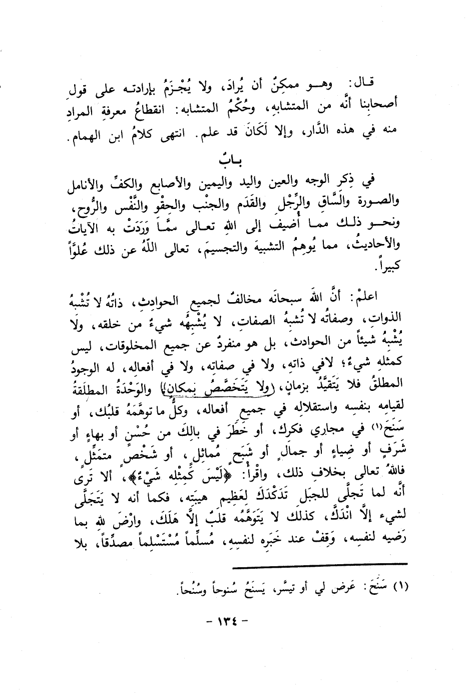 فِي ذكر الْوَجْه وَالْعين وَالْيَد وَالْيَمِين والأصابع والكف والأنامل وَالصُّورَة والساق وَالرجل والقدم وَالْجنب والحقو وَالنَّفس وَالروح وَنَحْو ذَلِك مِمَّا أضيف إِلَى الله تَعَالَى مِمَّا وَردت بِهِ الْآيَات وَالْأَحَادِيث مِمَّا يُوهم التَّشْبِيه والتجسيم تَعَالَى الله عَن ذَلِك علو كَبِيرا