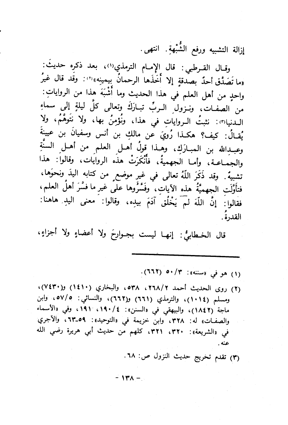 وَقَالَ الْقُرْطُبِيّ قَالَ الإِمَام التِّرْمِذِيّ بعد ذكره حَدِيث مَا تصدق أحد بِصَدقَة إِلَّا أَخذهَا الرحمان بِيَمِينِهِ وَقد قَالَ غير وَاحِد من أهل الْعلم فِي هَذَا الحَدِيث وَمَا أشبه هَذَا من الرِّوَايَات من الصِّفَات ونزول الرب تبَارك وَتَعَالَى كل لَيْلَة إِلَى سَمَاء الدُّنْيَا نثبت الرِّوَايَات فِي هَذَا ونؤمن بهَا وَلَا نتوهم وَلَا يُقَال كَيفَ هَكَذَا رُوِيَ عَن مَالك بن أنس وسُفْيَان بن عُيَيْنَة وعبد الله بن الْمُبَارك وَهَذَا وَقَول أهل الْعلم من أهل السّنة والجماة وَأما الْجَهْمِية فأنكرت هَذِه الرِّوَايَات وَقَالُوا هَذَا تَشْبِيه وَقد ذكر الله تَعَالَى فِي غير مَوضِع من كِتَابه الْيَد وَنَحْوهَا فتأولت الْجَهْمِية هَذِه الْآيَات وفسروها على غير مَا فسر أهل الْعلم فَقَالُوا إِن الله لم يخلق آدم بِيَدِهِ وَقَالُوا معنى الْيَد هَا هُنَا الْقُدْرَة