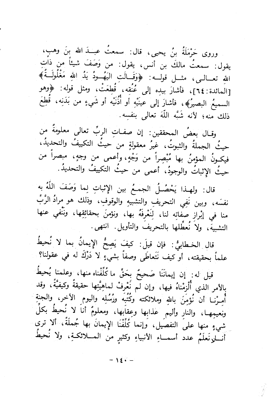 وروى حَرْمَلَة بن يحيى قَالَ سَمِعت عبد الله بن وهب يَقُول سَمِعت مَالك بن أنس يَقُول من وصف شَيْئا من ذَات الله تَعَالَى مثل قَوْله {وَقَالَت الْيَهُود يَد الله مغلولة} الْمَائِدَة 64 فَأَشَارَ بِيَدِهِ إِلَى عُنُقه قطعت وَمثل قَوْله {وَهُوَ السَّمِيع الْبَصِير} فَأَشَارَ إِلَى عَيْنَيْهِ أَو أُذُنَيْهِ أَو شَيْء من بدنه قطع ذَلِك مِنْهُ لِأَنَّهُ شبه الله تَعَالَى بِنَفسِهِ