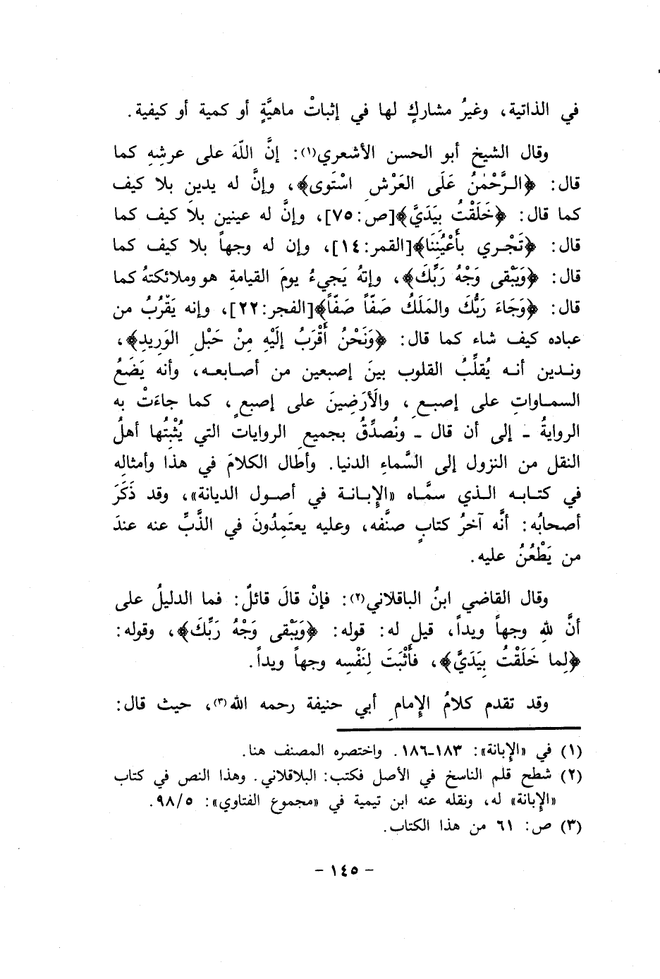 وَقَالَ القَاضِي ابْن الباقلاني فَإِن قَالَ قَائِل فَمَا الدَّلِيل على أَن لله وَجها ويدا قيل لَهُ قَوْله {وَيبقى وَجه رَبك} وَقَوله {لما خلقت بيَدي} فَأثْبت لنَفسِهِ وَجها ويدا