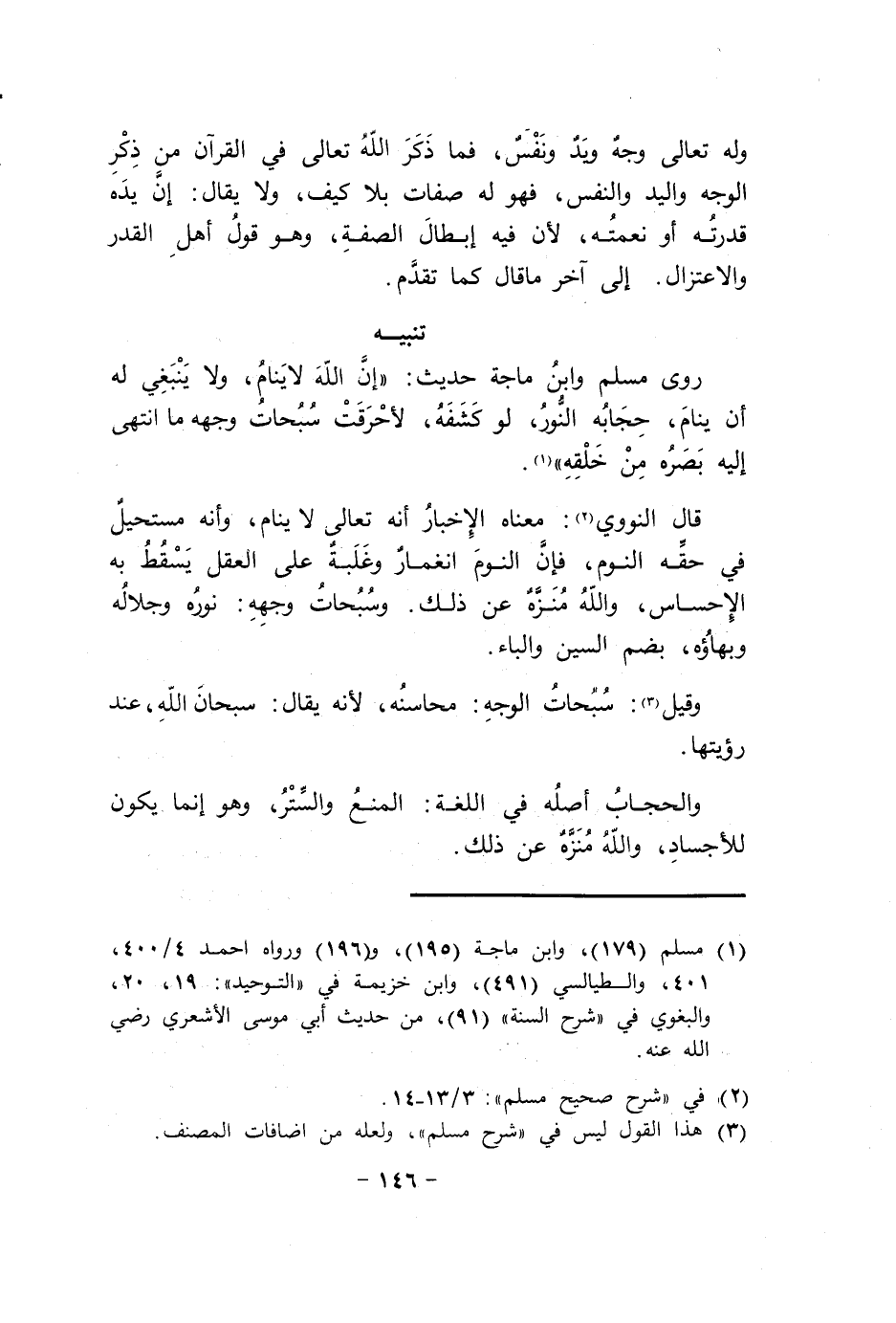 روى مُسلم وَابْن ماجة حَدِيث إِن الله لَا ينَام وَلَا يَنْبَغِي لَهُ أَن ينَام حجابه النُّور لَو كشفه لأحرقت سبحات وَجهه مَا انْتهى إِلَيْهِ بَصَره من خلقه