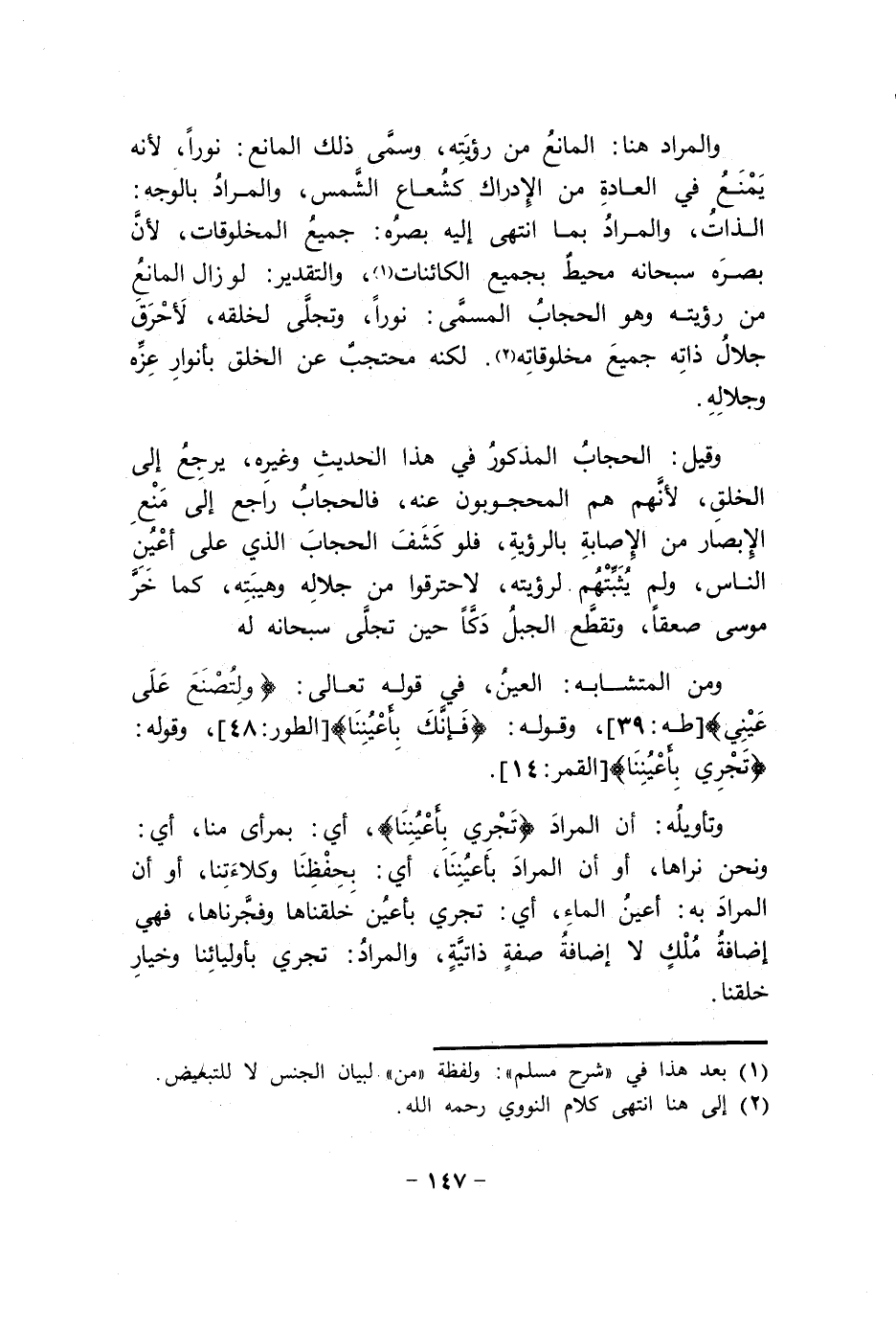 وَالْمرَاد هُنَا الْمَانِع من رُؤْيَته وسمى ذَلِك الْمَانِع نور لِأَنَّهُ يمْنَع فِي الْعَادة من الْإِدْرَاك كشعاع الشَّمْس وَالْمرَاد بِالْوَجْهِ الذَّات وَالْمرَاد بِمَا انْتهى إِلَيْهِ بَصَره جَمِيع الْمَخْلُوقَات لِأَن بَصَره سُبْحَانَهُ مُحِيط بِجَمِيعِ الكائنات وَالتَّقْدِير لَو زَالَ الْمَانِع من رُؤْيَته وَهُوَ الْحجاب الْمُسَمّى نورا وتجلى لخلقه لأحرق جلال ذَاته جَمِيع مخلوقاته لكنه محتجب عَن الْخلق بأنوار عزه وجلاله