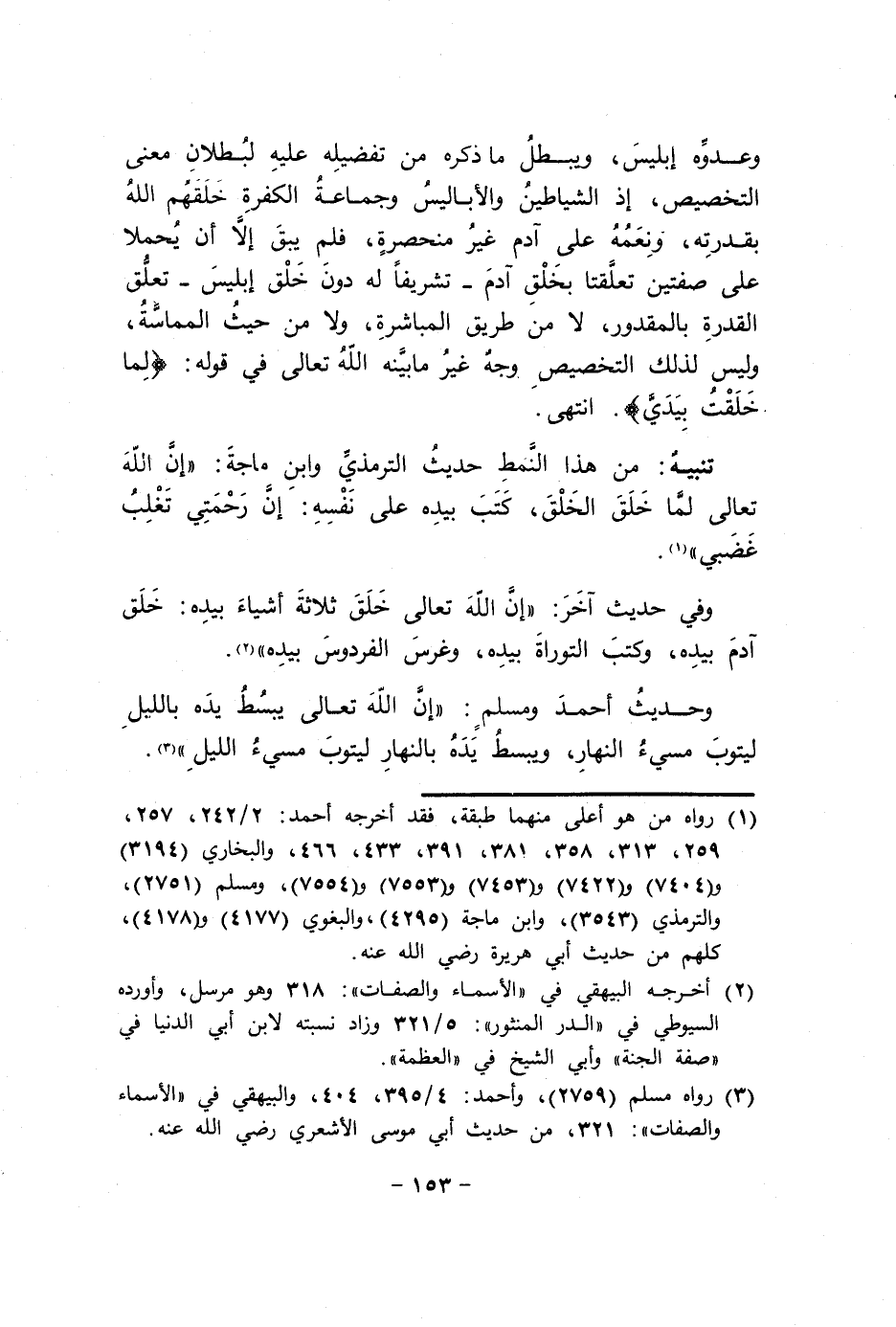 وَفِي حَدِيث آخر إِن الله تَعَالَى خلق ثَلَاثَة أَشْيَاء بِيَدِهِ خلق آدم بِيَدِهِ وَكتب التَّوْرَاة بِيَدِهِ وغرس الفردوس بِيَدِهِ