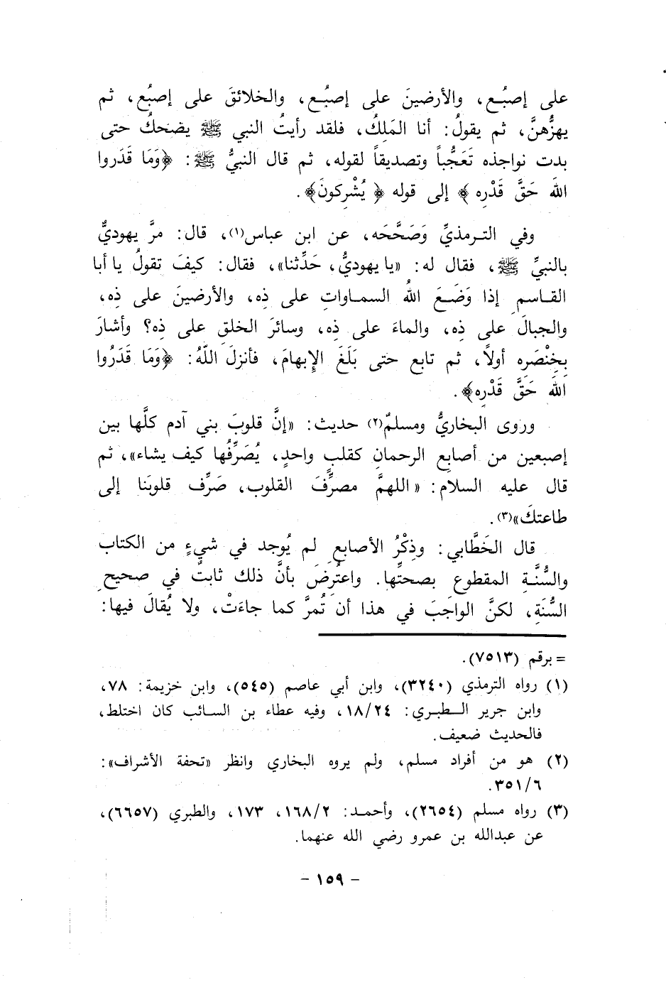 وروى البُخَارِيّ وَمُسلم حَدِيث إِن قُلُوب بني آدم كلهَا بَين إِصْبَعَيْنِ من أَصَابِع الرحمان كقلب وَاحِد يصرفهَا كَيفَ يَشَاء ثمَّ قَالَ عَلَيْهِ السَّلَام اللَّهُمَّ مصرف الْقُلُوب صرف قُلُوبنَا إِلَى طَاعَتك