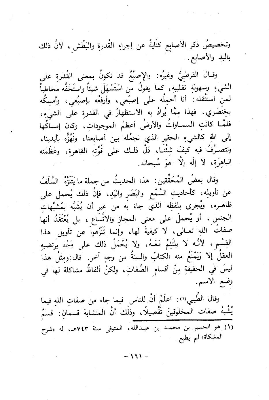 وَقَالَ الطَّيِّبِيّ اعْلَم أَن للنَّاس فِيمَا جَاءَ من صِفَات الله فِيمَا يشبه صِفَات المخلوقين تَفْصِيلًا وَذَلِكَ أَن الْمُتَشَابه قِسْمَانِ قسم