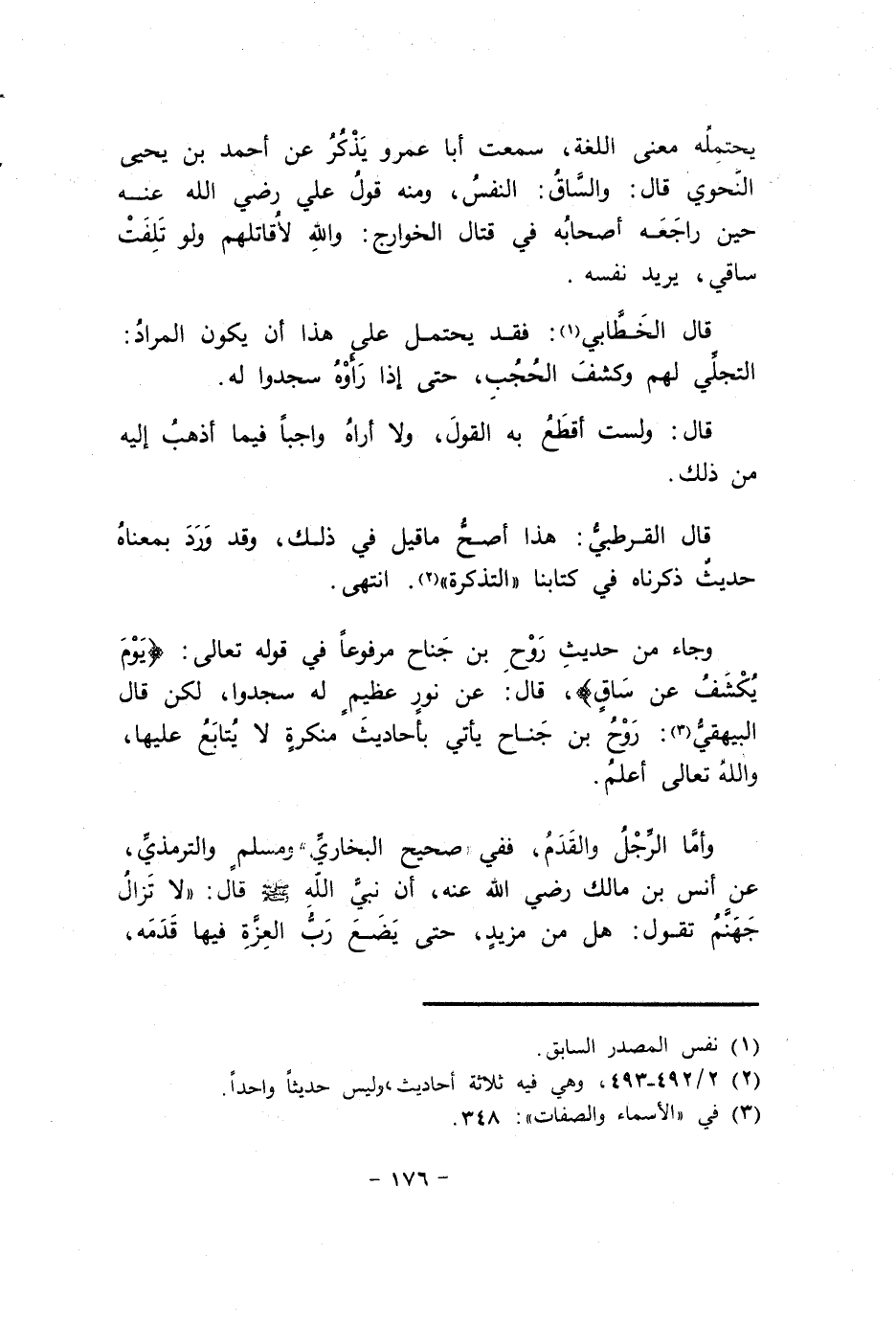 وَجَاء من حَدِيث روح بن جنَاح مَرْفُوعا فِي قَوْله تَعَالَى {يَوْم يكْشف عَن سَاق} قَالَ عَن نور عَظِيم لَهُ سجدوا لَكِن قَالَ الْبَيْهَقِيّ روح بن جنَاح يَأْتِي بِأَحَادِيث مُنكرَة لَا يُتَابع عَلَيْهَا وَالله تَعَالَى أعلم