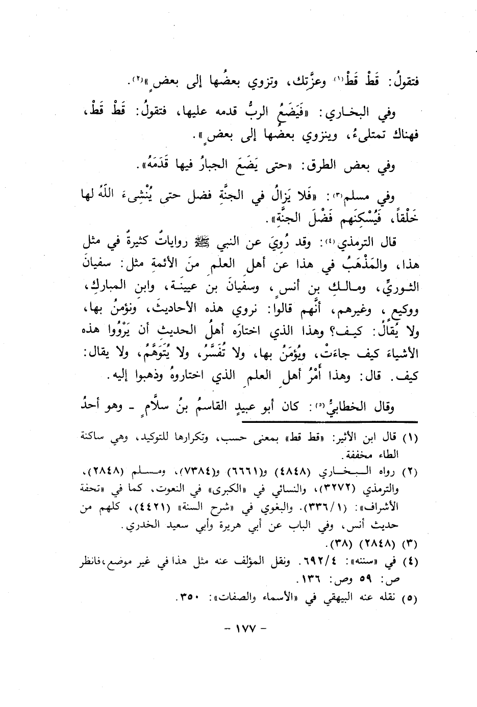 قَالَ التِّرْمِذِيّ وَقد رُوِيَ عَن النَّبِي صلى الله عَلَيْهِ وَسلم رِوَايَات كَثِيرَة فِي مثل هَذَا وَالْمذهب فِي هَذَا عَن أهل الْعلم من الْأَئِمَّة مثل سُفْيَان الثَّوْريّ وَمَالك بن أنس وسُفْيَان بن عُيَيْنَة وَابْن الْمُبَارك ووكيع وَغَيرهم أَنهم قَالُوا نروي هَذِه الْأَحَادِيث ونؤمن بهَا وَلَا يُقَال كَيفَ وَهَذَا الَّذِي اخْتَارَهُ أهل الحَدِيث أَن يرووا هَذِه الْأَشْيَاء كَيفَ جَاءَت ويؤمن بهَا وَلَا تفسر وَلَا يتَوَهَّم وَلَا يُقَال كَيفَ قَالَ وَهَذَا أَمر أهل الْعلم الَّذِي أختاروه وذهبوا إِلَيْهِ