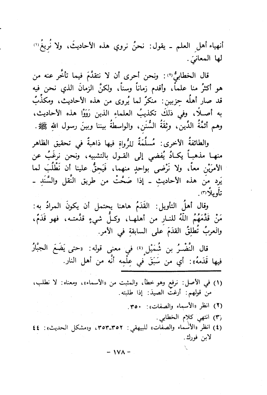 والطائفة الْأُخْرَى مسلمة للرواة فِيهَا ذَاهِبَة فِي تَحْقِيق الظَّاهِر مِنْهَا مذهبا يكَاد يُفْضِي إِلَى القَوْل بالتشبيه وَنحن نرغب عَن الْأَمريْنِ مَعًا وَلَا نرضى بِوَاحِد مِنْهُمَا فيحق علينا أَن نطلب لما يرد من هَذِه الْأَحَادِيث إِذا صحت من طَرِيق النَّقْل والسند تَأْوِيلا