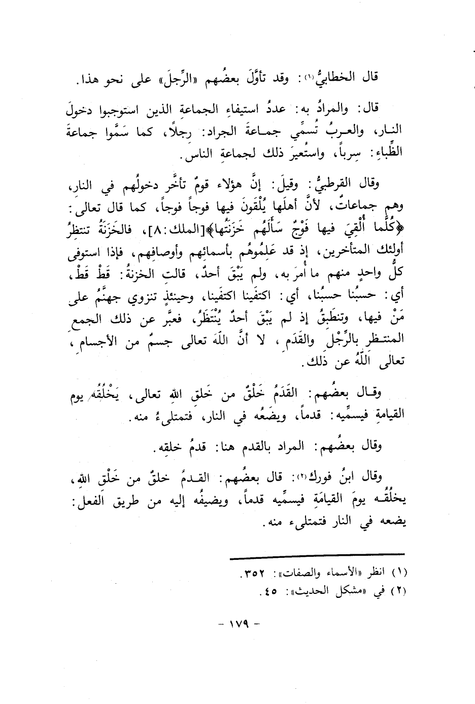 وَقَالَ ابْن فورك قَالَ بَعضهم الْقدَم خلق من خلق الله يخلقه يَوْم الْقِيَامَة فيسميه قدما ويضيفه إِلَيْهِ من طَرِيق الْفِعْل يَضَعهُ فِي النَّار فتمتلئ مِنْهُ
