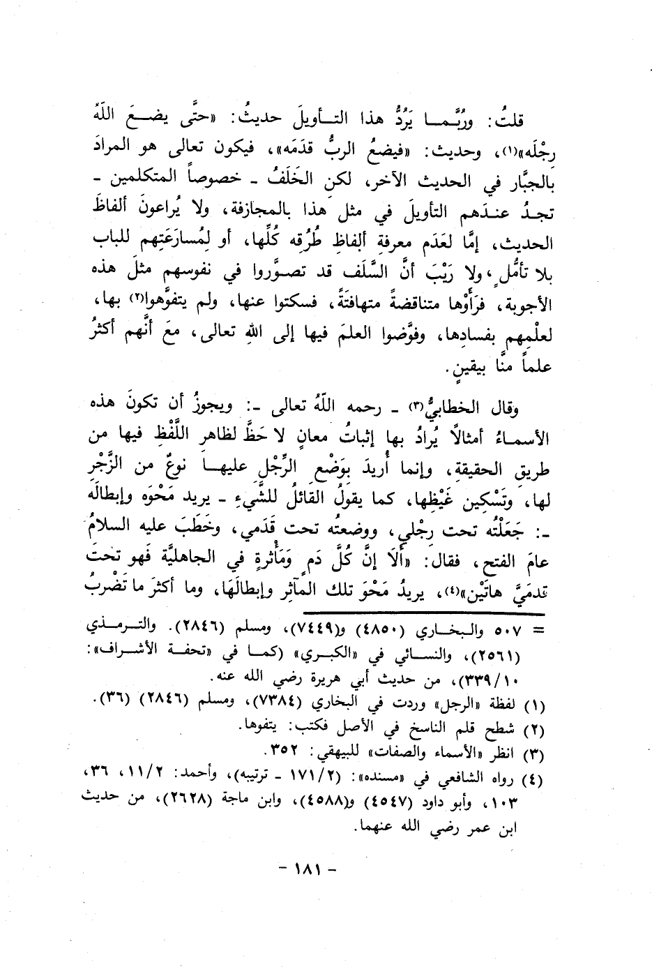 قلت وَرُبمَا يرد هَذَا التَّأْوِيل حَدِيث حَتَّى يضع الله رجله وَحَدِيث فَيَضَع الرب قدمه فَيكون تَعَالَى هُوَ المُرَاد بالجبار فِي الحَدِيث الآخر لَكِن الْخلف خُصُوصا الْمُتَكَلِّمين تَجِد عِنْدهم التَّأْوِيل فِي مثل هَذَا بالمجازفة وَلَا يراعون أَلْفَاظ الحَدِيث إِمَّا لعدم معرفَة أَلْفَاظ طرقه كلهَا أَو لمسارعتهم للباب بِلَا تَأمل وَلَا ريب أَن السّلف قد تصوروا فِي نُفُوسهم مثل هَذِه الْأَجْوِبَة فرأوها متناقضة متهافتة فَسَكَتُوا عَنْهَا وَلم يتفوهوا بهَا لعلمهم بفسادها وفوضوا الْعلم فِيهَا إِلَى الله تَعَالَى مَعَ أَنهم أَكثر علما منا بِيَقِين