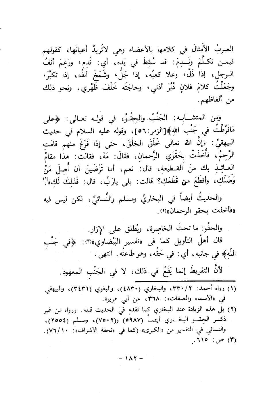 وَمن الْمُتَشَابه الْجنب والحقو فِي قَوْله تَعَالَى {على مَا فرطت فِي جنب الله} الزمر 56 وَقَوله عَلَيْهِ السَّلَام فِي حَدِيث الْبَيْهَقِيّ إِن الله تَعَالَى خلق الْخلق حَتَّى إِذا فرغ مِنْهُ قَامَت الرَّحِم فَأخذت بحقوي الرحمان فَقَالَ مَه فَقَالَت هَذَا مقَام العائذ بك من القطيعة قَالَ نعم أما ترْضينَ أَن أصل من وصلك وأقطع من قَطعك قَالَت بلَى يَا رب قَالَ فَذَلِك لَك