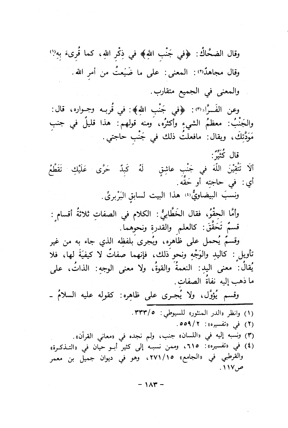 وَقسم يحمل على ظَاهره وَيجْرِي بِلَفْظِهِ الَّذِي جَاءَ بِهِ من غير تَأْوِيل كَالْيَدِ وَالْوَجْه وَنَحْو ذَلِك فَإِنَّهُمَا صِفَات لَا كَيْفيَّة لَهَا فَلَا يُقَال معنى الْيَد النِّعْمَة وَالْقُوَّة وَلَا معنى الْوَجْه الذَّات على مَا ذهب إِلَيْهِ نفاة الصِّفَات