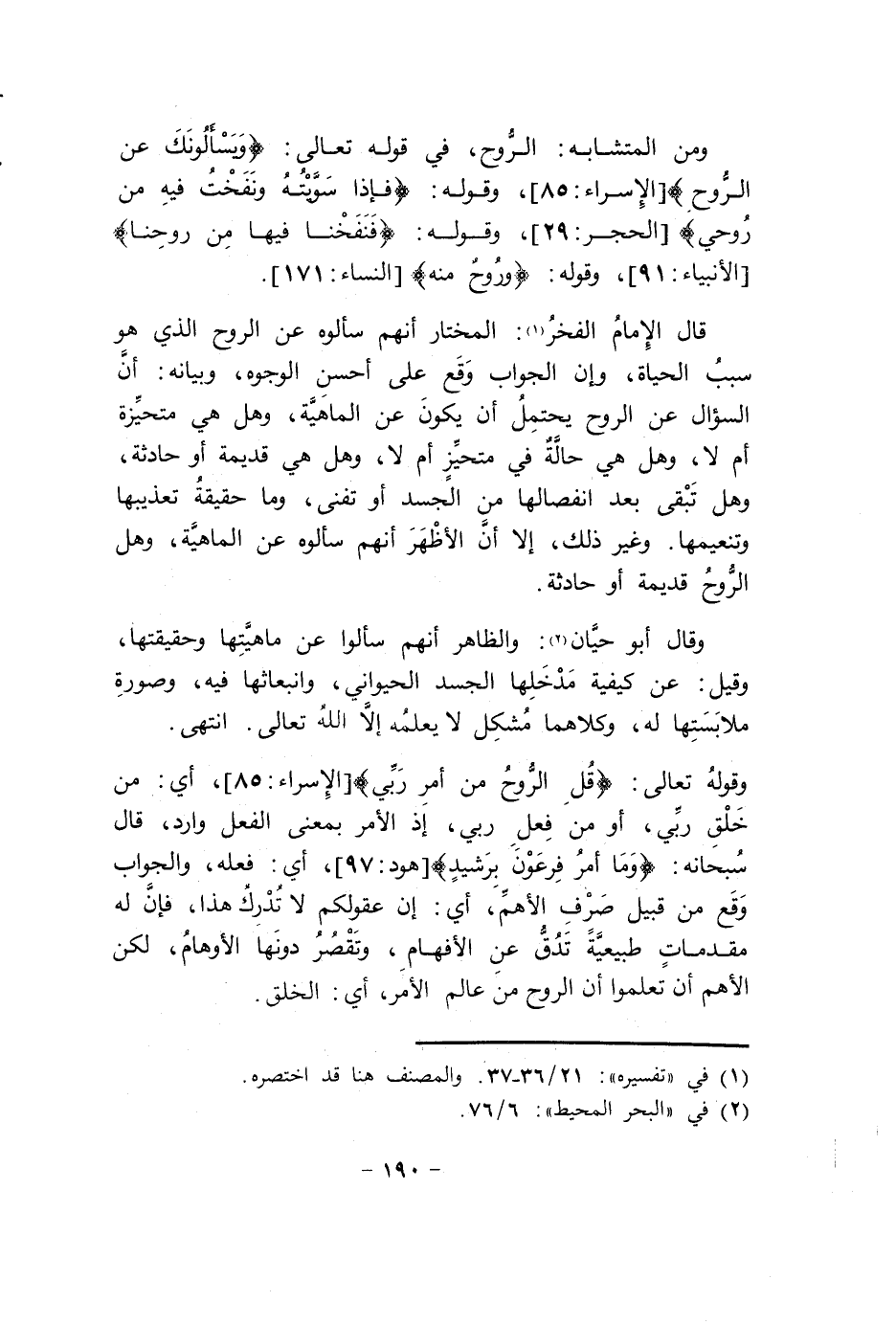 وَقَوله تَعَالَى {قل الرّوح من أَمر رَبِّي} الْإِسْرَاء 85 أَي من خلق رَبِّي أَو من فعل رَبِّي إِذْ الْأَمر بِمَعْنى الْفِعْل وَارِد قَالَ سُبْحَانَهُ {وَمَا أَمر فِرْعَوْن برشيد} هود 97 أَي فعله وَالْجَوَاب وَقع من قبيل صرف الأهم أَي إِن عقولكم لَا تدْرك هَذَا فَإِن لَهُ مُقَدمَات طبيعية تدق عَن الأفهام وتقصر دونهَا الأوهام لَكِن الأهم أَن تعلمُوا أَن الرّوح من عَالم الْأَمر أَي الْخلق