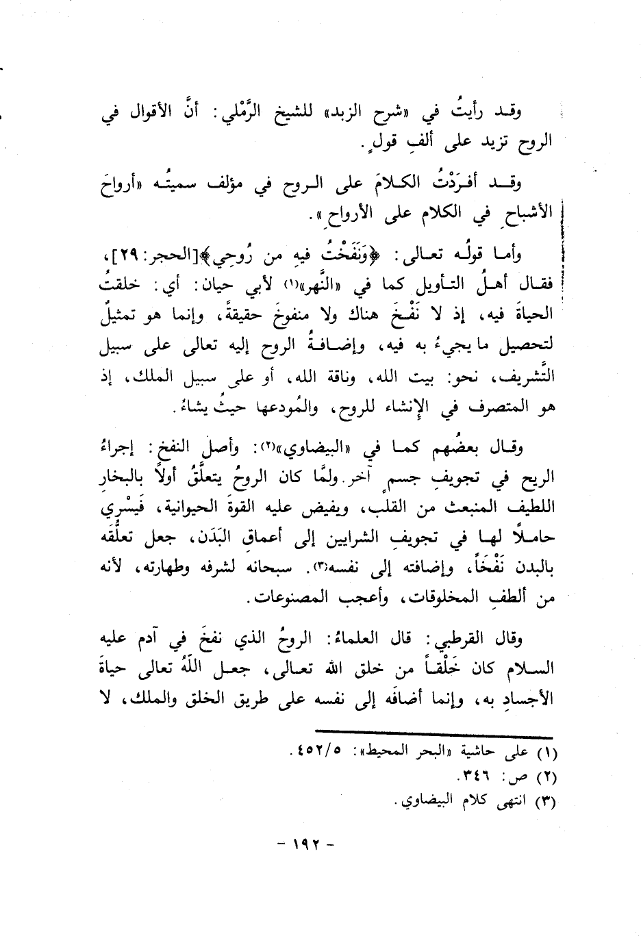 وَأما قَوْله تَعَالَى {ونفخت فِيهِ من روحي} الْحجر 29 فَقَالَ أهل التَّأْوِيل كَمَا فِي النَّهر لأبي حَيَّان أَي خلقت الْحَيَاة فِيهِ إِذْ لَا نفخ هُنَاكَ وَلَا منفوخ حَقِيقَة وَإِنَّمَا هُوَ تَمْثِيل لتَحْصِيل مَا يَجِيء بِهِ فِيهِ وَإِضَافَة الرّوح إِلَيْهِ تَعَالَى على سَبِيل التشريف نَحْو بَيت الله وناقة الله أَو على سَبِيل الْملك إِذْ هُوَ الْمُتَصَرف فِي الْإِنْشَاء للروح والمودعها حَيْثُ يَشَاء