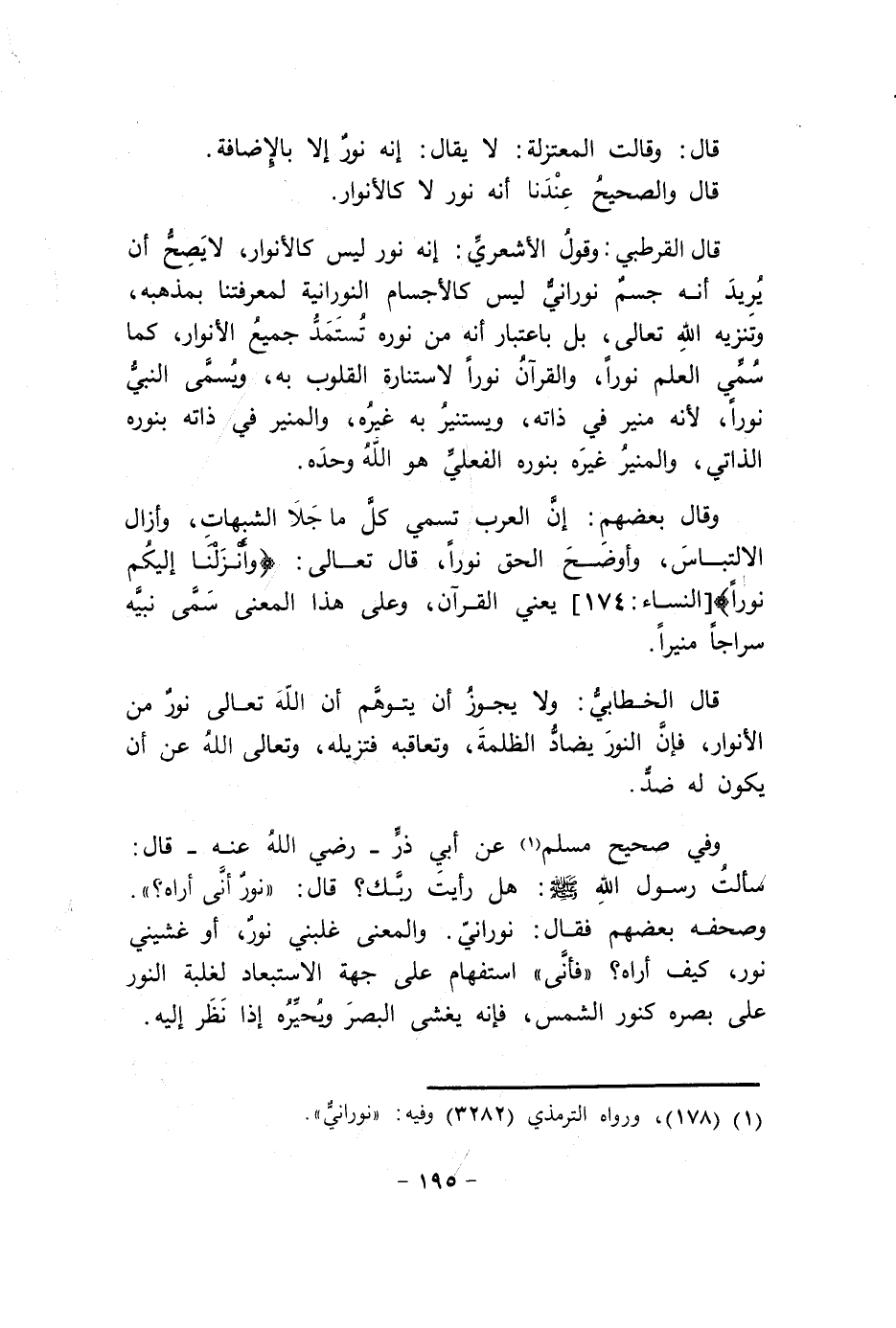 قَالَ الْقُرْطُبِيّ وَقَول الْأَشْعَرِيّ إِنَّه نور لَيْسَ كالأنوار لَا يَصح أَن يُرِيد أَنه جسم نوراني لَيْسَ كالأجسام النورانية لمعرفتنا بمذهبه وتنزيه الله تَعَالَى بل بِاعْتِبَار أَنه من نوره تستمد جَمِيع الْأَنْوَار كَمَا سمي الْعلم نورا وَالْقُرْآن نورا لاستنارة الْقُلُوب بِهِ وَيُسمى النَّبِي نور لِأَنَّهُ مُنِير فِي ذَاته ويستنير بِهِ غَيره والمنير فِي ذَاته بنوره الذاتي والمنير غَيره بنوره الْفعْلِيّ هُوَ الله وَحده
