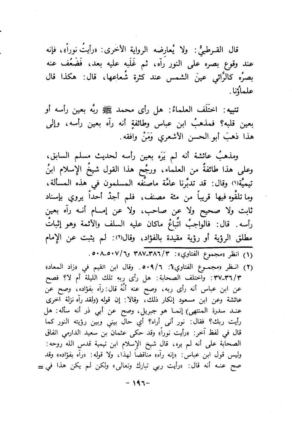 وَمذهب عَائِشَة أَنه لم يره بِعَين رَأسه لحَدِيث مُسلم السَّابِق وعَلى هَذَا طَائِفَة من الْعلمَاء وَرجح هَذَا القَوْل شيخ الْإِسْلَام ابْن تَيْمِية وَقَالَ قد تدبرنا عَامَّة مَا صنفه الْمُسلمُونَ فِي هَذِه الْمَسْأَلَة وَمَا تلقوهُ فِيهَا قَرِيبا من مئة مُصَنف فَلم أجد أحدا يروي بِإِسْنَاد ثَابت وَلَا صَحِيح وَلَا عَن صَاحب وَلَا عَن إِمَام أَنه رَآهُ بِعَين رَأسه قَالَ فَالْوَاجِب اتِّبَاع مَا كَانَ عَلَيْهِ السّلف وَالْأَئِمَّة وَهُوَ إِثْبَات مُطلق الرُّؤْيَة أَو رُؤْيَة مُقَيّدَة بالفؤاد وَقَالَ لم يثبت عَن الإِمَام