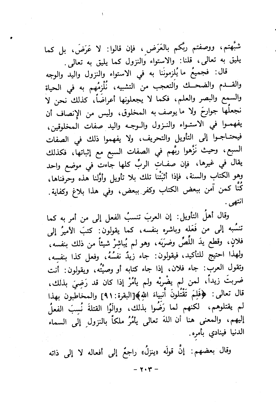 قَالَ فَجَمِيع مَا يلزموننا بِهِ فِي الإستواء وَالنُّزُول وَالْيَد وَالْوَجْه والقدم والضحك والتعجب من التَّشْبِيه نلزمهم بِهِ فِي الْحَيَاة والسمع وَالْبَصَر وَالْعلم فَكَمَا لَا يجعلونها أعراضا كَذَلِك نَحن لَا نَجْعَلهَا جوارح وَلَا مَا يُوصف بِهِ الْمَخْلُوق وَلَيْسَ من الْإِنْصَاف أَن يفهموا فِي الإستواء وَالنُّزُول وَالْوَجْه وَالْيَد صِفَات المخلوقين فيحتاجوا إِلَى التَّأْوِيل والتحريف وَلَا يفهموا ذَلِك فِي الصِّفَات السَّبع وَحَيْثُ نزهوا رَبهم فِي الصِّفَات السَّبع مَعَ إِثْبَاتهَا فَكَذَلِك يُقَال فِي غَيرهَا فَإِن صِفَات الرب كلهَا جَاءَت فِي مَوضِع وَاحِد وَهُوَ الْكتاب وَالسّنة فَإِذا أثبتنا تِلْكَ بِلَا تَأْوِيل وأولنا هَذِه وحرفناها كُنَّا كمن آمن بِبَعْض الْكتاب وَكفر بِبَعْض وَفِي هَذَا بَلَاغ وكفاية أنْتَهى