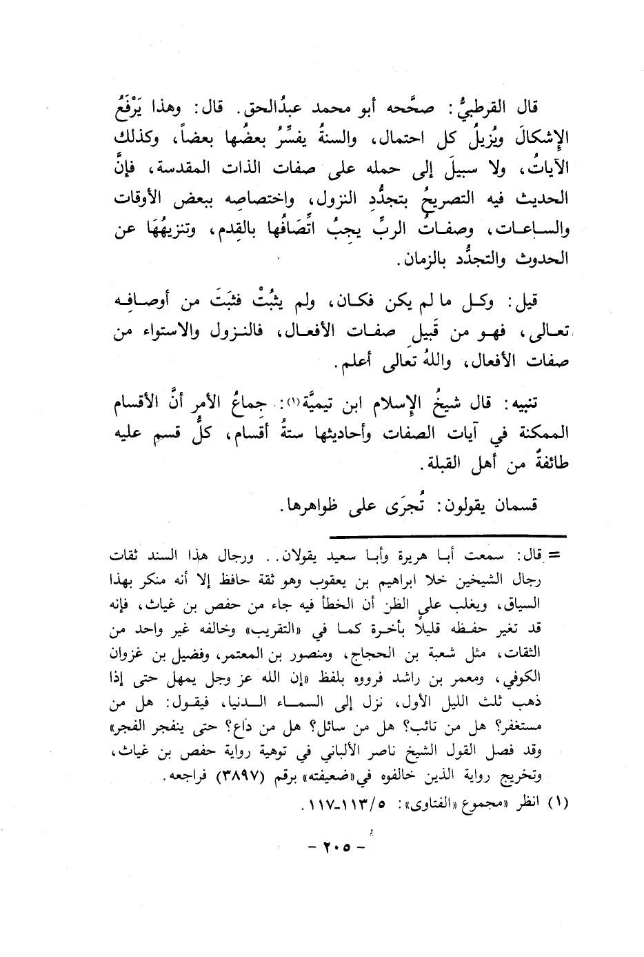 قَالَ الْقُرْطُبِيّ صَححهُ أَبُو مُحَمَّد عبد الحق قَالَ وَهَذَا يرفع الْإِشْكَال ويزيل كل احْتِمَال وَالسّنة يُفَسر بَعْضهَا بَعْضًا وَكَذَلِكَ الْآيَات وَلَا سَبِيل إِلَى حمله على صِفَات الذَّات المقدسة فَإِن الحَدِيث فِيهِ التَّصْرِيح بتجدد النُّزُول واختصاصه بِبَعْض الْأَوْقَات والساعات وصفات الرب يجب اتصفاها بالقدم وتنزيهها عَن الْحُدُوث والتجدد بِالزَّمَانِ