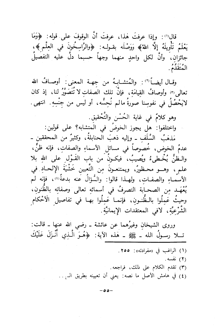 وَقَالَ أَيْضا والمتشابه من جِهَة الْمَعْنى أَوْصَاف الله تَعَالَى وأوصاف الْقِيَامَة فَإِن تِلْكَ الصِّفَات لَا تتَصَوَّر لنا إِذْ كَانَ لَا يحصل فِي نفوسنا صُورَة مَا لم نحسه أَو لَيْسَ من جنسه انْتهى